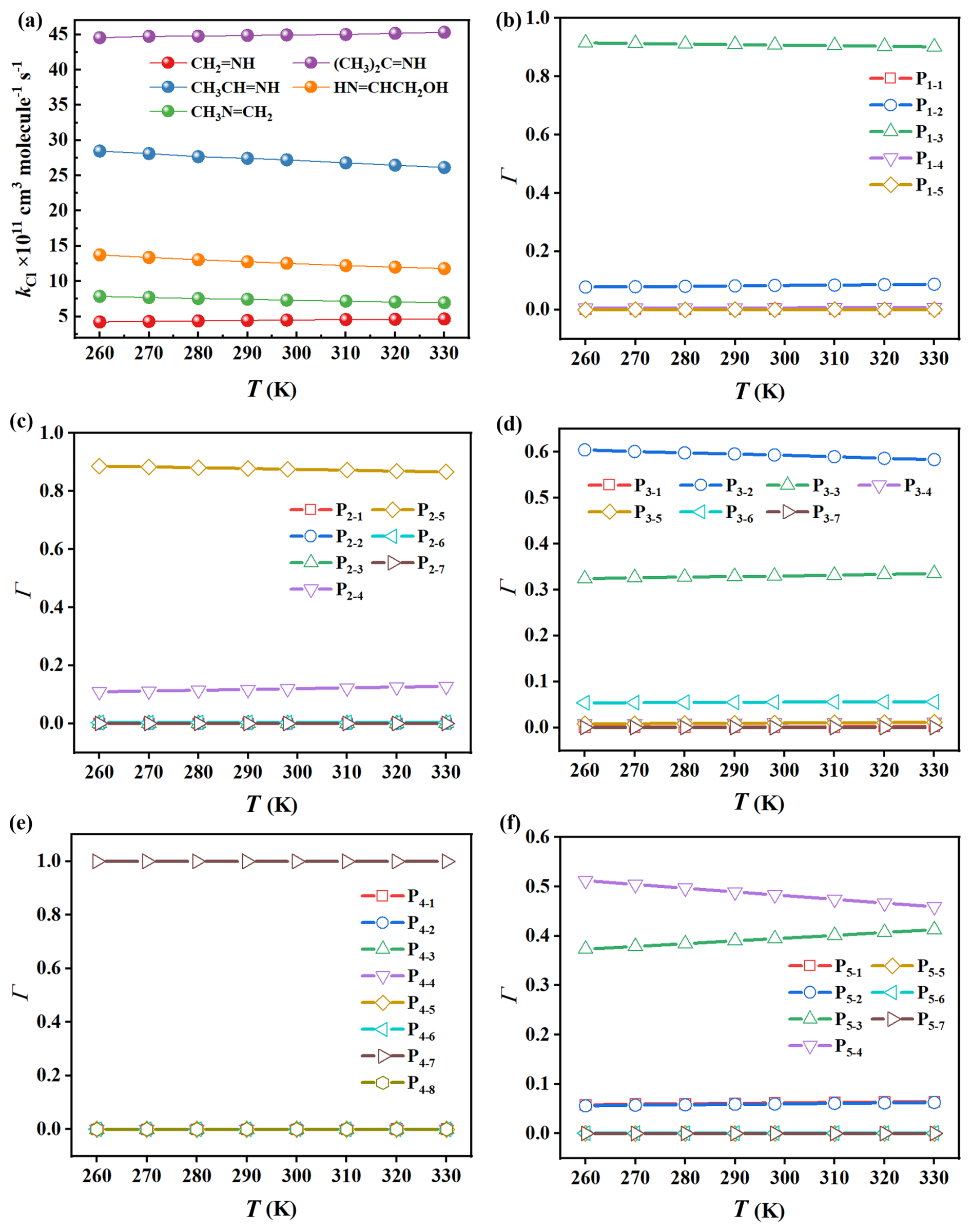 Figure 1Reaction rate constants (kCl) for the reactions of five imines (a), and branching ratios (Γ) for products for the reactions of (b) CH2=NH, (c) CH3CH=NH, (d) CH3N=CH2, (e) (CH3)2C=NH, and (f) HN=CHCH2OH initiated by •Cl in the temperature range of 260–300 K at 1 atm.