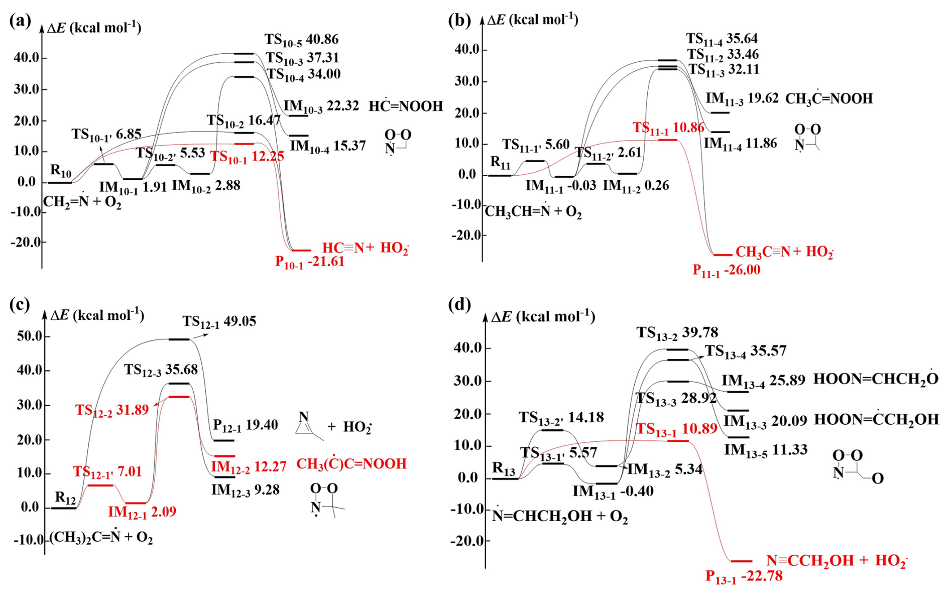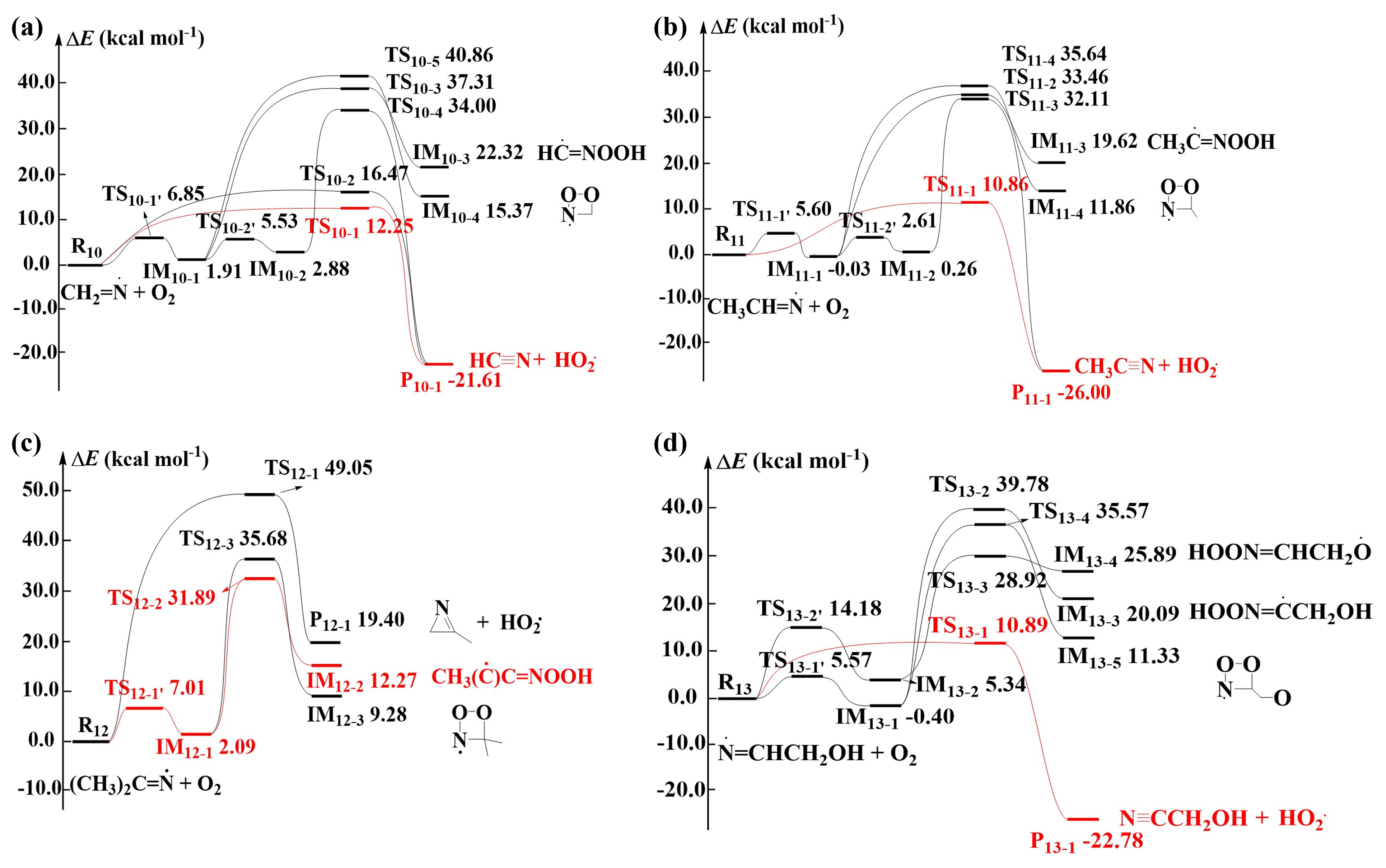 Figure 2Schematic ZPE-corrected PES for the reactions of O2 with (a) CH2=N•, (b) CH3CH=N•, (c) (CH3)2C=N•, and (d) •N=CHCH2OH at the CCSD(T)/6-311+G(2df,2p)//M06-2X/6-31+G(d,p) level of theory.