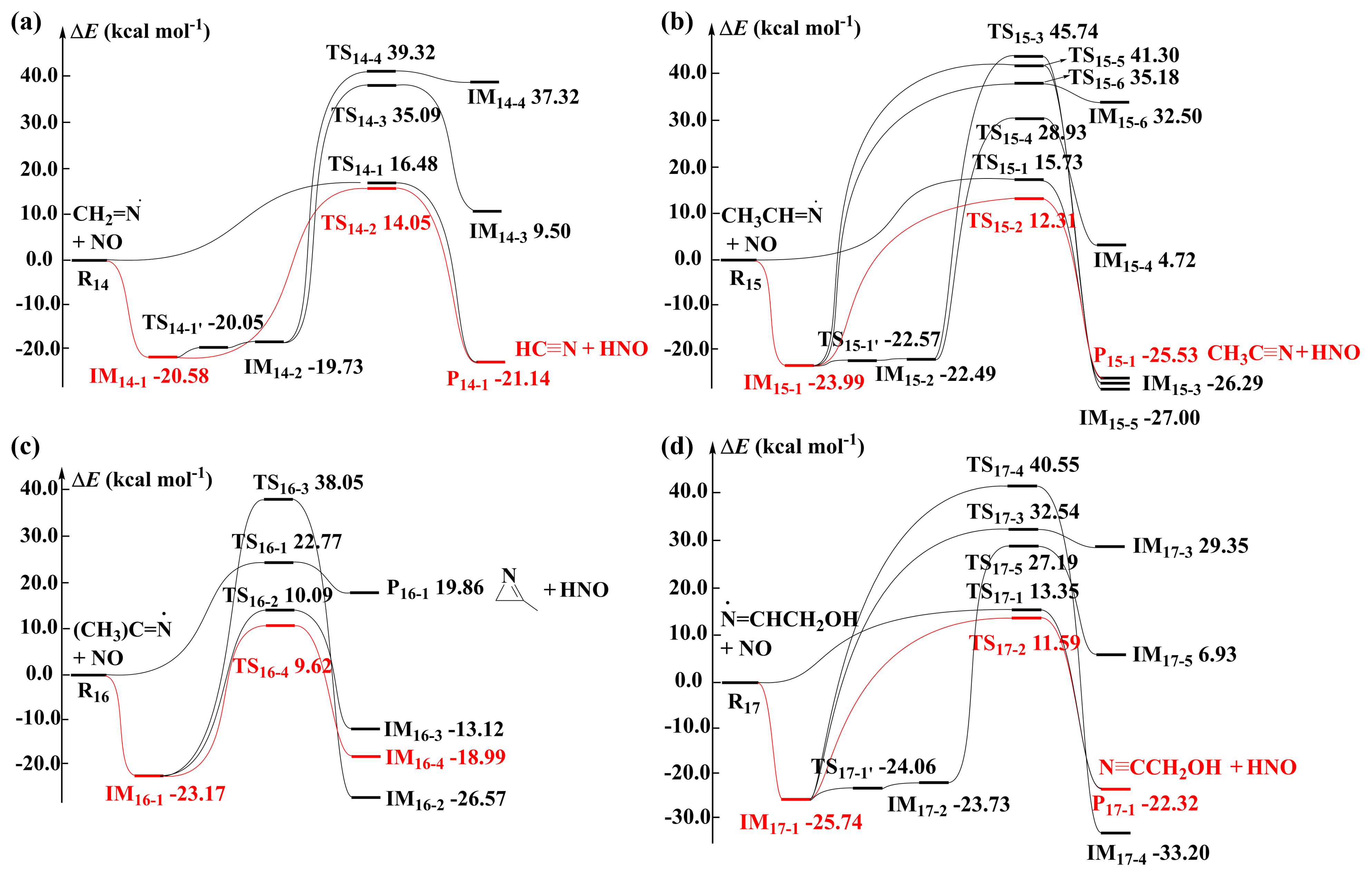 Figure 3Schematic ZPE-corrected PES for the reactions of NO with (a) CH2=N•, (b) CH3CH=N•, (c) (CH3)2C=N•, and (d) •N=CHCH2OH at the CCSD(T)/6-311+G(2df,2p)//M06-2X/6-31+G(d,p) level of theory.