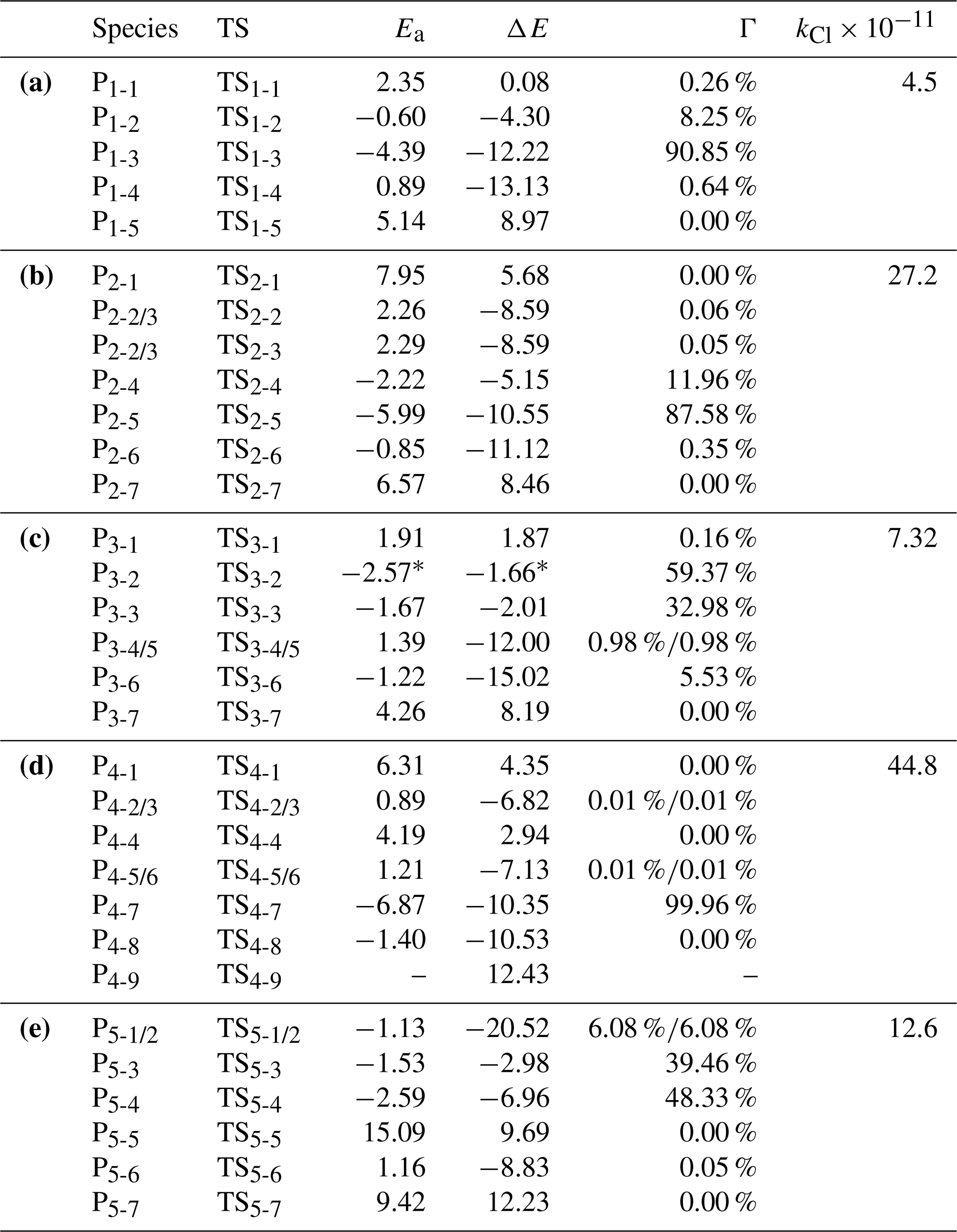 Table 1Calculated reaction activation energies (Ea, in kcal mol−1), thermodynamic energies (ΔE, kcal mol−1), branch ratios (Γ) and reaction rate constants (kCl, in cm3 molecule−1 s−1) for the reactions of •Cl with (a) CH2=NH, (b) CH3CH=NH, (c) CH3N=CH2, (d) (CH3)2C=NH, and (e) HN=CHCH2OH at the CCSD(T)/aug-cc-pVTZ//MP2/6-31+G(3df,2p) level of theory.