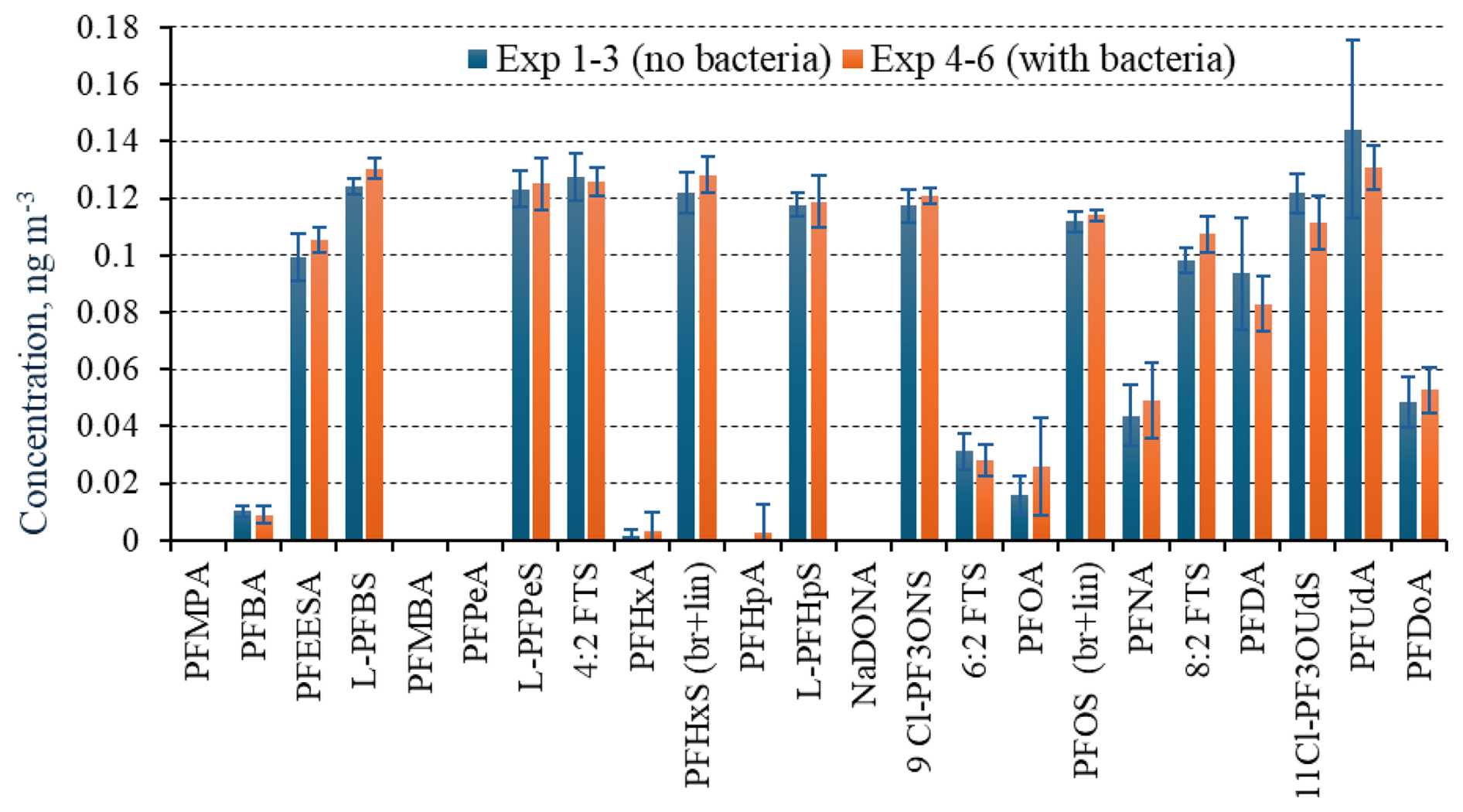 Figure 1Aerosol-phase concentrations of individual PFAS measured in total suspended particles (TSP) during PFAS-only experiments (Exp 1–3, blue) and PFAS + Pseudomonas fluorescens–seeded experiments (Exp 4–6, orange). Error bars show the standard deviation across three chamber replicates with duplicate LC–MS analyses per replicate (n=6). PFAS are arranged along the x axis according to carbon chain length. Overall, similar aerosol-phase PFAS concentrations are observed with and without biological material, indicating no systematic bacterial influence.