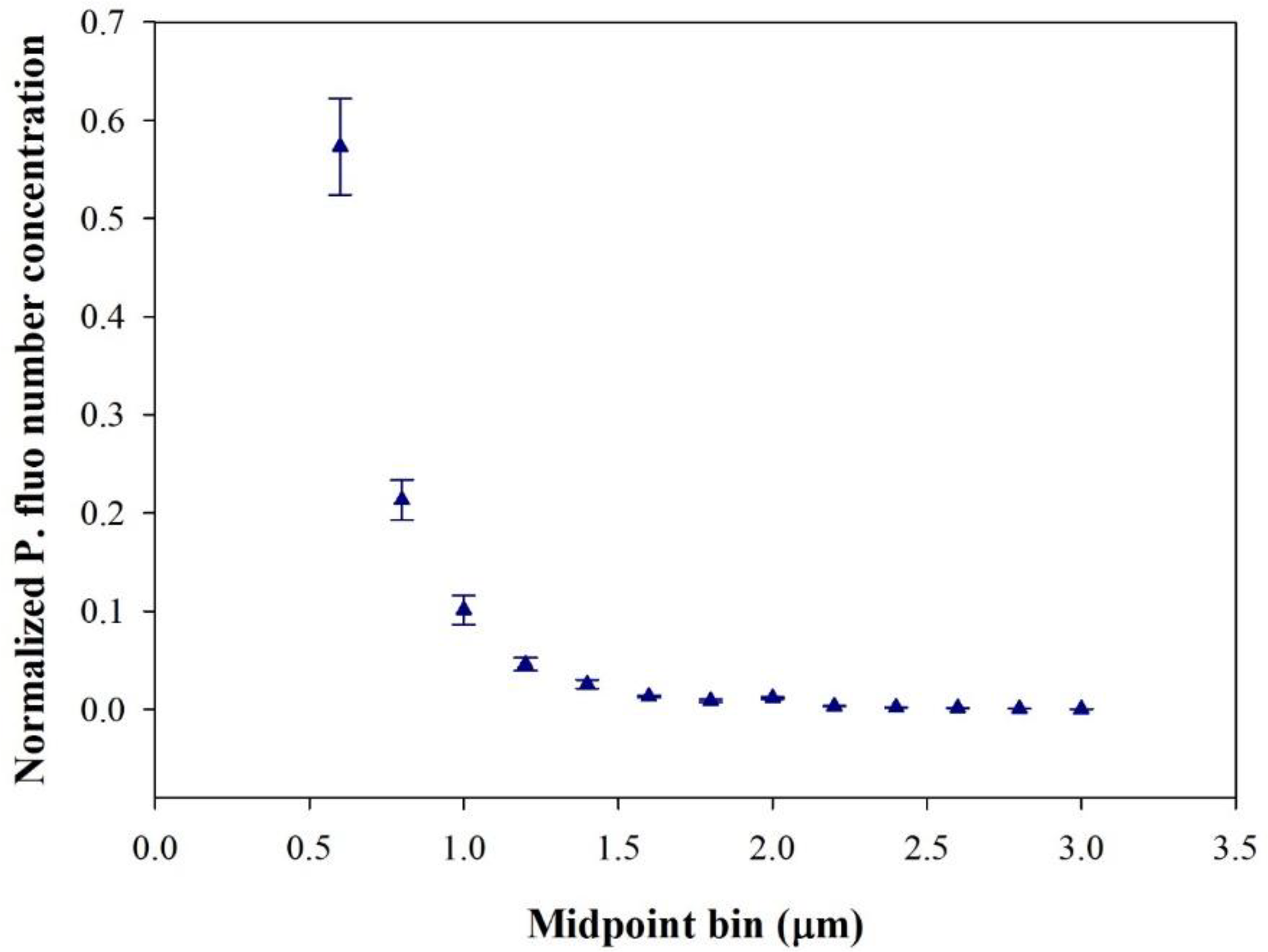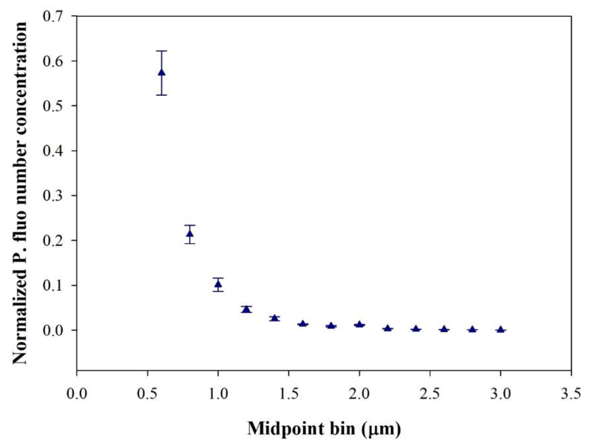 Figure 2Normalised particle size distribution of Pseudomonas fluorescens nebulised in ChAMBRe (5 min after the end of bacteria nebulisation). Data represent the mean ± standard deviation of three replicate experiments. The dominant fraction of Pseudomonas fluorescens present in the chamber was observed around 0.6 µm.