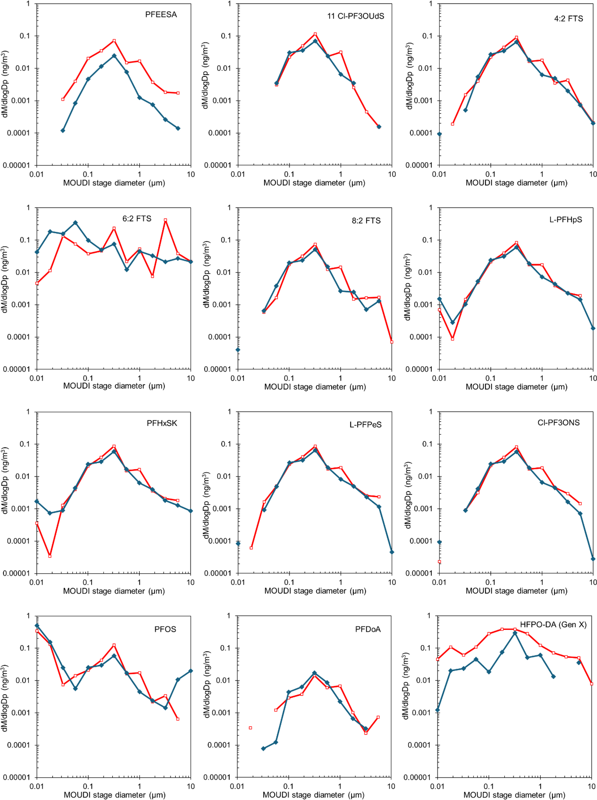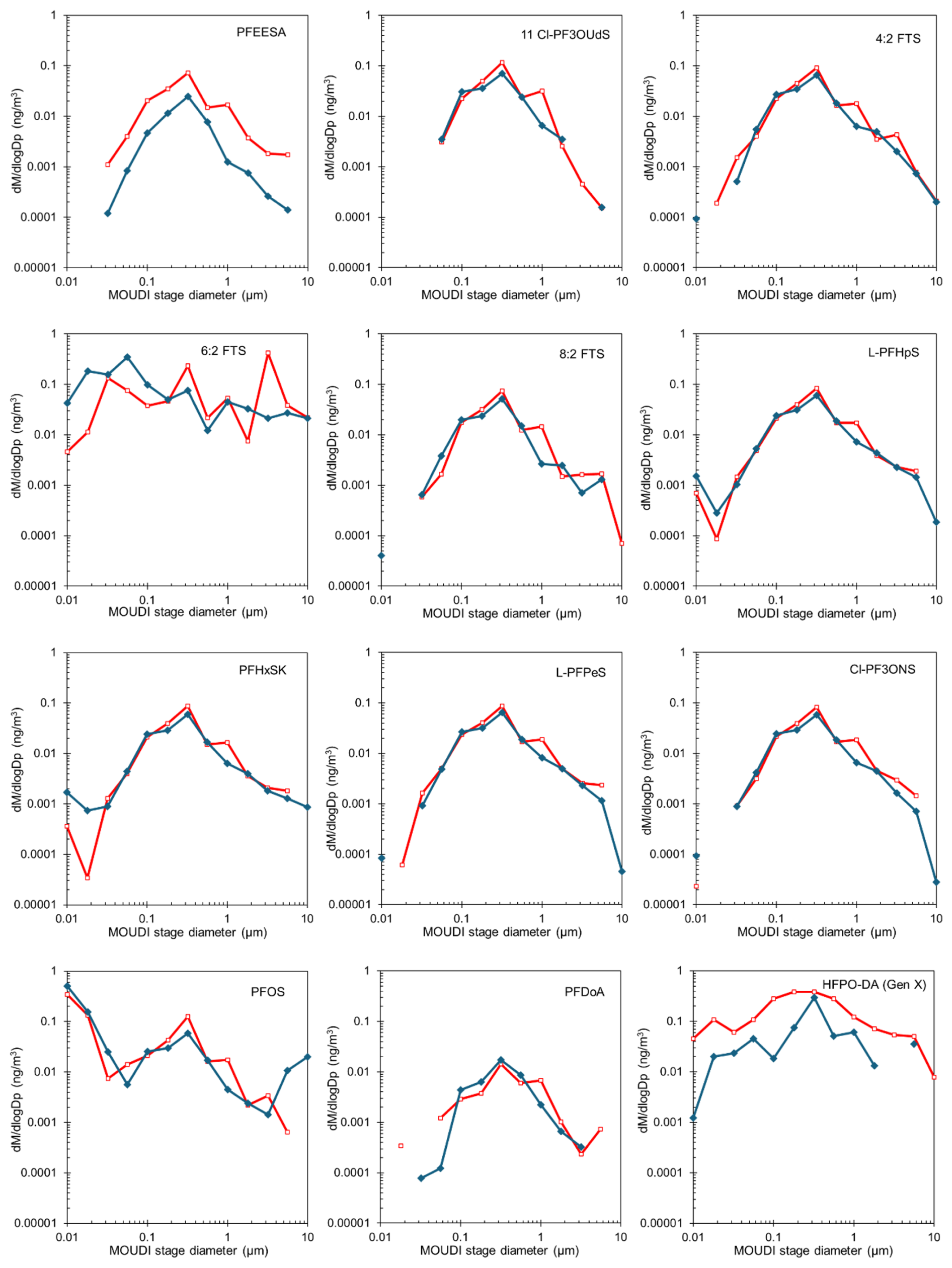 Figure 3Mass size distribution of aerosol from PFAS-only (blue symbols) and PFAS with Pseudomonas fluorescens seed (red symbols) experiments. Most PFAS exhibit a unimodal mass–size distribution centred near 0.3 µm, indicating dominant fine-mode aerosol association across compounds.