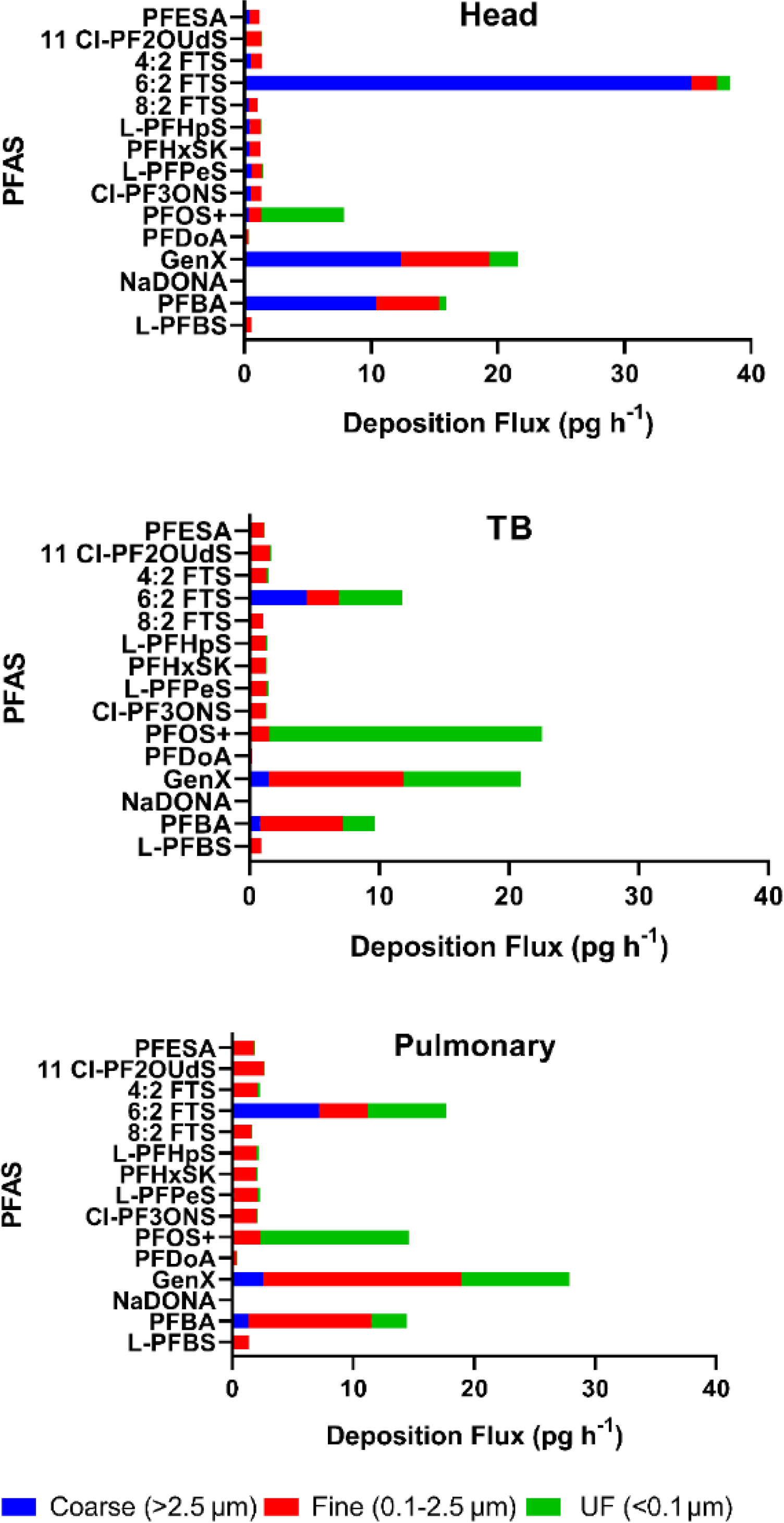 PFDoA and NaDONA were notable exceptions due to their significantly lower aerosol concentrations, resulting in total deposition fluxes of 1.18 and 0.138 pg h−1, respectively. PFDoA's size distribution was similar to the majority, yielding comparable regional deposition: 29 % to the head (0.34 pg h−1), 22 % to the TB region (0.26 pg h−1), and 36 % to the pulmonary region (0.43 pg h−1). NaDONA however exhibited an additional peak in the coarse fraction, shifting deposition toward the head region, which received 57 % of the total flux (0.08 pg h−1), while the TB and pulmonary regions received 13 % (0.02 pg h−1) and 21 % (0.03 pg h−1), respectively. PFOS and PFBA showed significantly higher aerosol concentrations, with total deposition fluxes of 48.1 and 44.3 pg h−1, respectively. PFBA had a similar size distribution to the majority but at higher concentration, resulting in deposition fractions of 36 % to the head (15.9 pg h−1), 22 % to the TB region (9.7 pg h−1), and 33 % to the pulmonary region (14.5 pg h−1). PFOS, however, had an additional peak in the ultrafine range, shifting deposition toward the TB region, which received 47 % of the total flux (22.5 pg h−1), while the head region received 16 % (7.9 pg h−1). GenX and 6:2 FTS exhibited the highest aerosol concentrations and deposition fluxes, at 77.5 and 74.4 pg h−1, respectively. GenX followed the typical deposition pattern, with 28 % to the head (21.6 pg h−1), 27 % to the TB region (20.9 pg h−1), and 36 % to the pulmonary region (27.9 pg h−1). In contrast, 6:2 FTS had additional modes in both the ultrafine and coarse fractions, leading to a deposition profile skewed toward the head region, which received 52 % of the total flux (38.4 pg h−1), while the TB and pulmonary regions received 16 % (11.8 pg h−1) and 24 % (17.7 pg h−1), respectively. This pattern was similar to that observed for NaDONA.