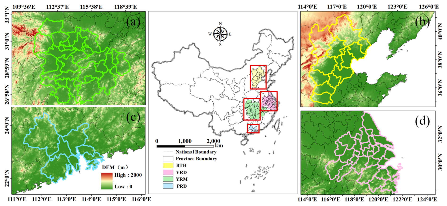 Figure 1Geographical distribution of four urban agglomerations over (a) the Yangtze River Middle Reaches, (b) Beijing–Tianjin–Hebei, (c) Pearl River Delta, and (d) Yangtze River Delta, which is superimposed with elevation. (source: GS(2024) 0650). Publisher's remark: please note that the above figure contains disputed territories.
