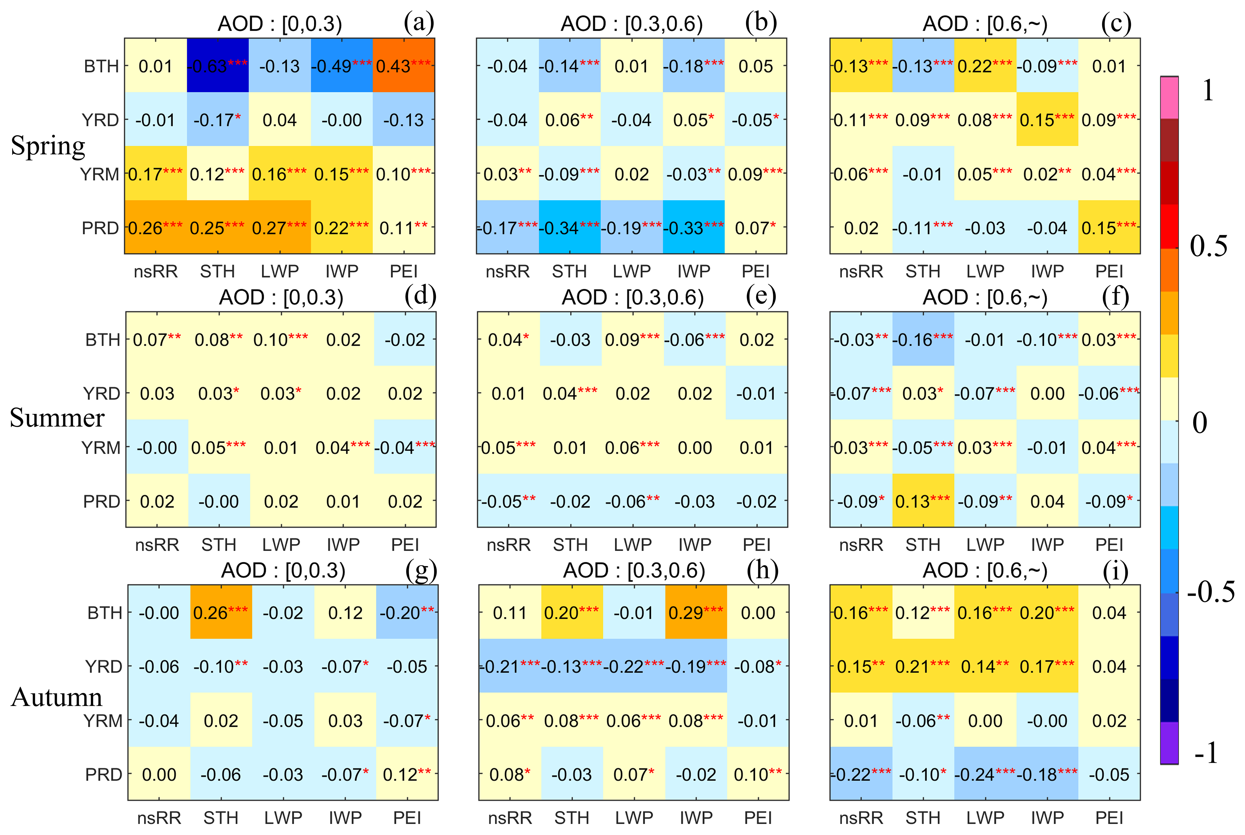 In the resulting heat map of convective precipitation (Fig. 2), individual cells exhibit Spearman correlation coefficients that quantify the relationship between AOD and key meteorological parameters. For spring convective precipitation (Fig. 2a–c), the BTH exhibits significant negative correlations with the STH and IWP under low aerosol loading, whereas showing a significant positive correlation with PEI. The YRD displays patterns similar to those of the BTH: negative correlations at low aerosol loading shift to positive correlations with precipitation parameters as aerosol loading increases. In contrast, both the YRM and PRD show consistently positive correlations under low aerosol loading (Fig. 2a). However, the PRD demonstrates pronounced negative correlations at moderate loading, whereas the YRM maintains positive correlations at high aerosol loading. Summer (Fig. 2d–g): Under low (high) AOD conditions, consistent positive (negative) correlations prevail across all study regions (Fig. 2d). At moderate aerosol loading levels, the PRD shifts to a negative correlation, whereas the other three regions retain a positive correlation (Fig. 2e). Autumn (Fig. 2g–i): the YRD exhibits pronounced negative correlations under low-to-moderate AOD thresholds. Conversely, the BTH and YRD (PRD) demonstrate positive (negative) correlations under high AOD levels. Overall, the precipitation under varying aerosol loading exhibits pronounced seasonal and regional disparities, demonstrating nonlinear characteristics in their relationships.