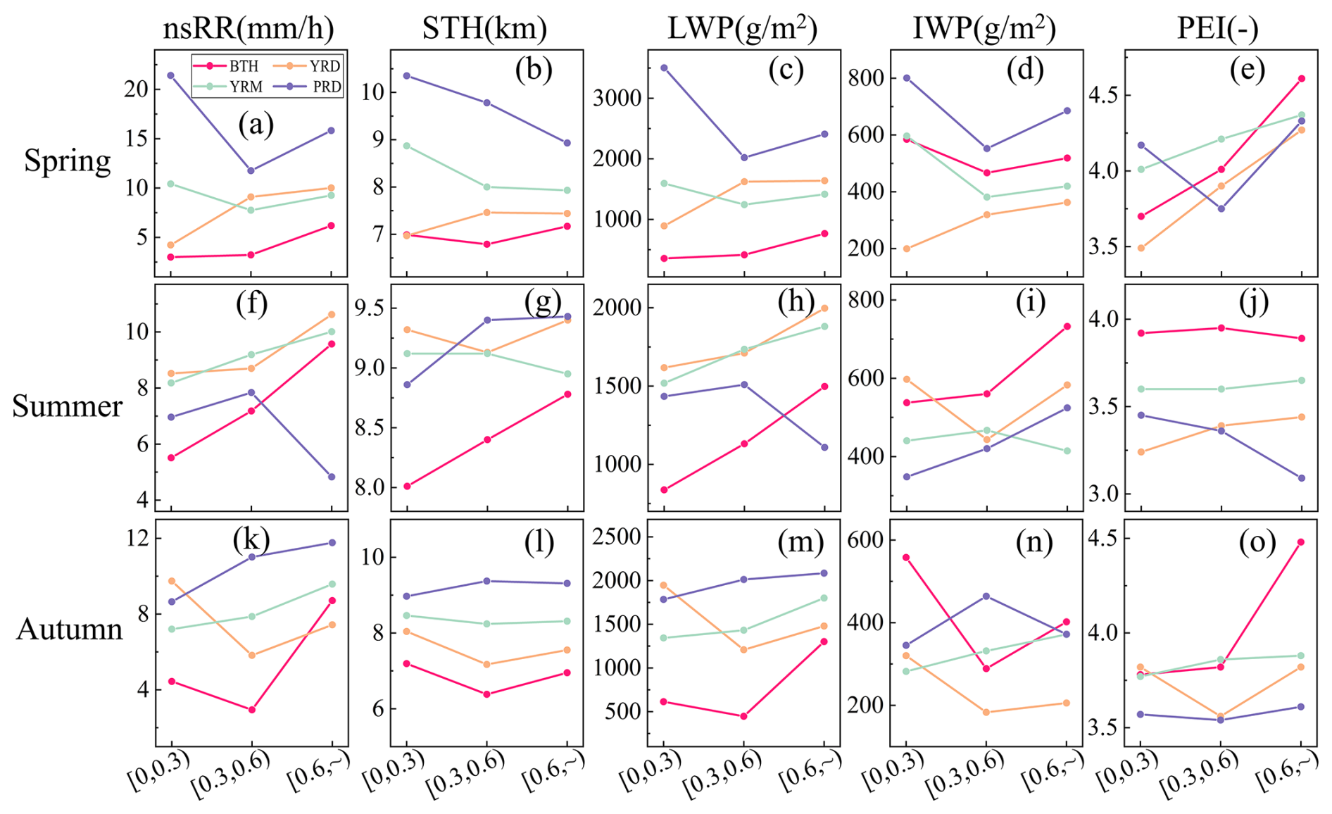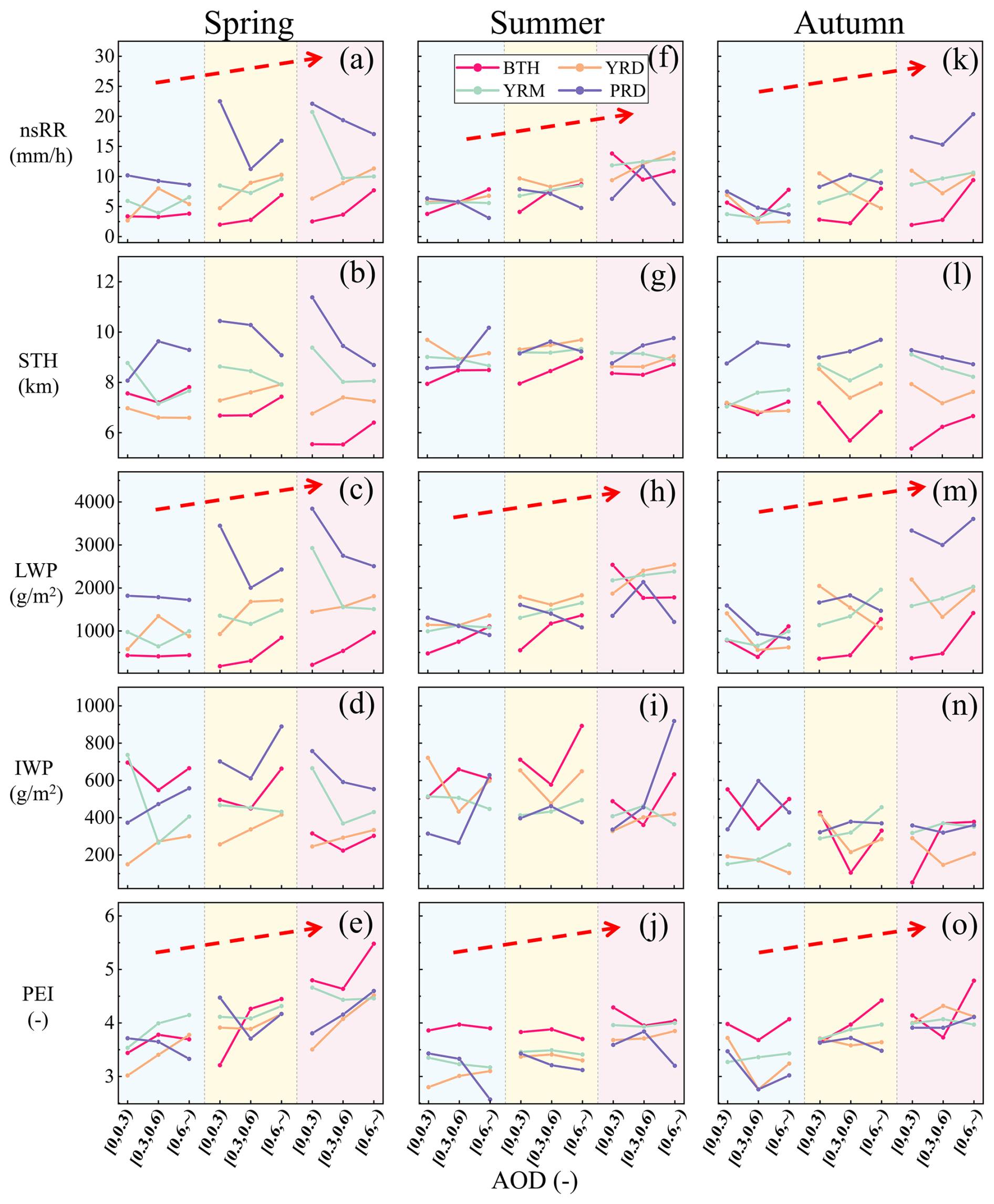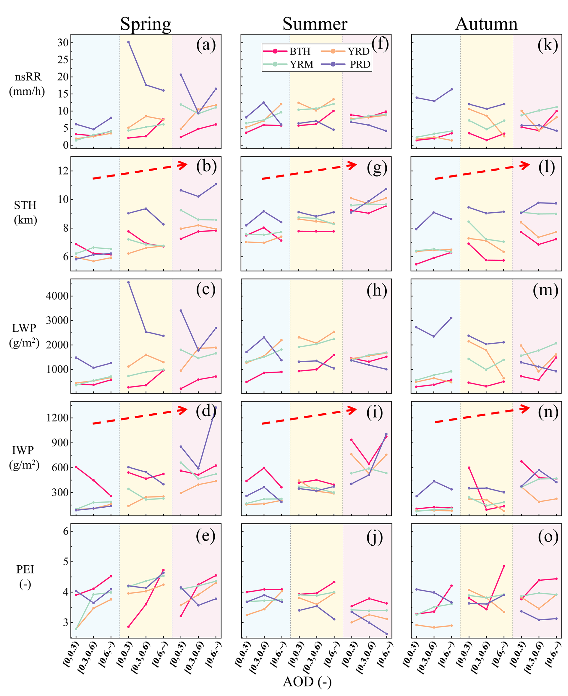 Figure 3Average point line plots of nsRR, STH, LWP, IWP, and PEI under three AOD conditions for convective precipitation across the four regions and three seasons. Each subplot employs color-coding (BTH – red, YRD – yellow, YRM – green, and PRD – purple) with the x-axis denoting AOD bins ([0,0.3), [0.3,0.6), [0.6,)) and the y-axis representing parameter magnitudes. “–” indicates dimensionless (after scaling by 1000).