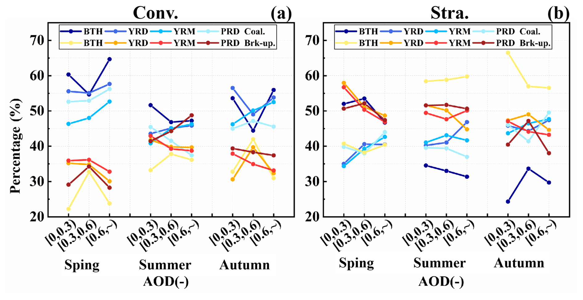 Figure 5Average point line plots of coalescence and break-up processes in precipitation across different regions and seasons (Spr. – Spring, Sum. – Summer, and Aut. – Autumn) under three AOD conditions. Here, (a) represents convective precipitation, and (b) represents stratiform precipitation. And “–” indicates dimensionless.