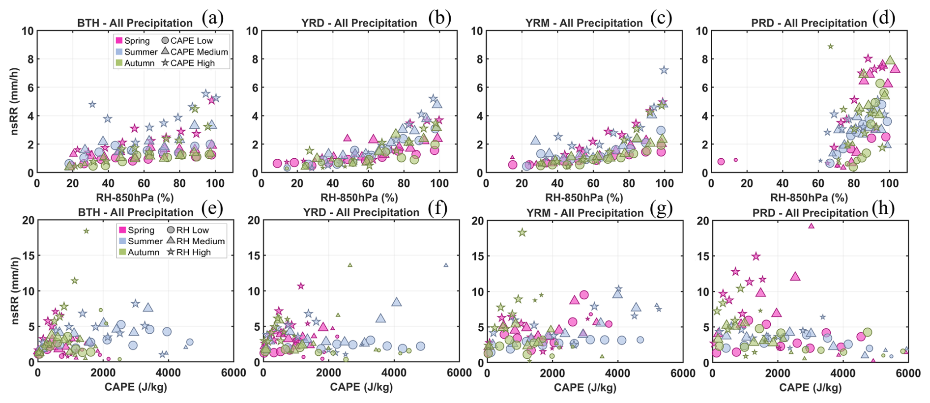 Figure 6nsRR as a function of RH at 850 hPa (CAPE), stratified by season (color) and CAPE (RH) level (symbol), for all precipitation types (convective and stratiform) in the four regions. The symbol size is proportional to the sample size ([0,20), [20,45), [45,90), [90,)).