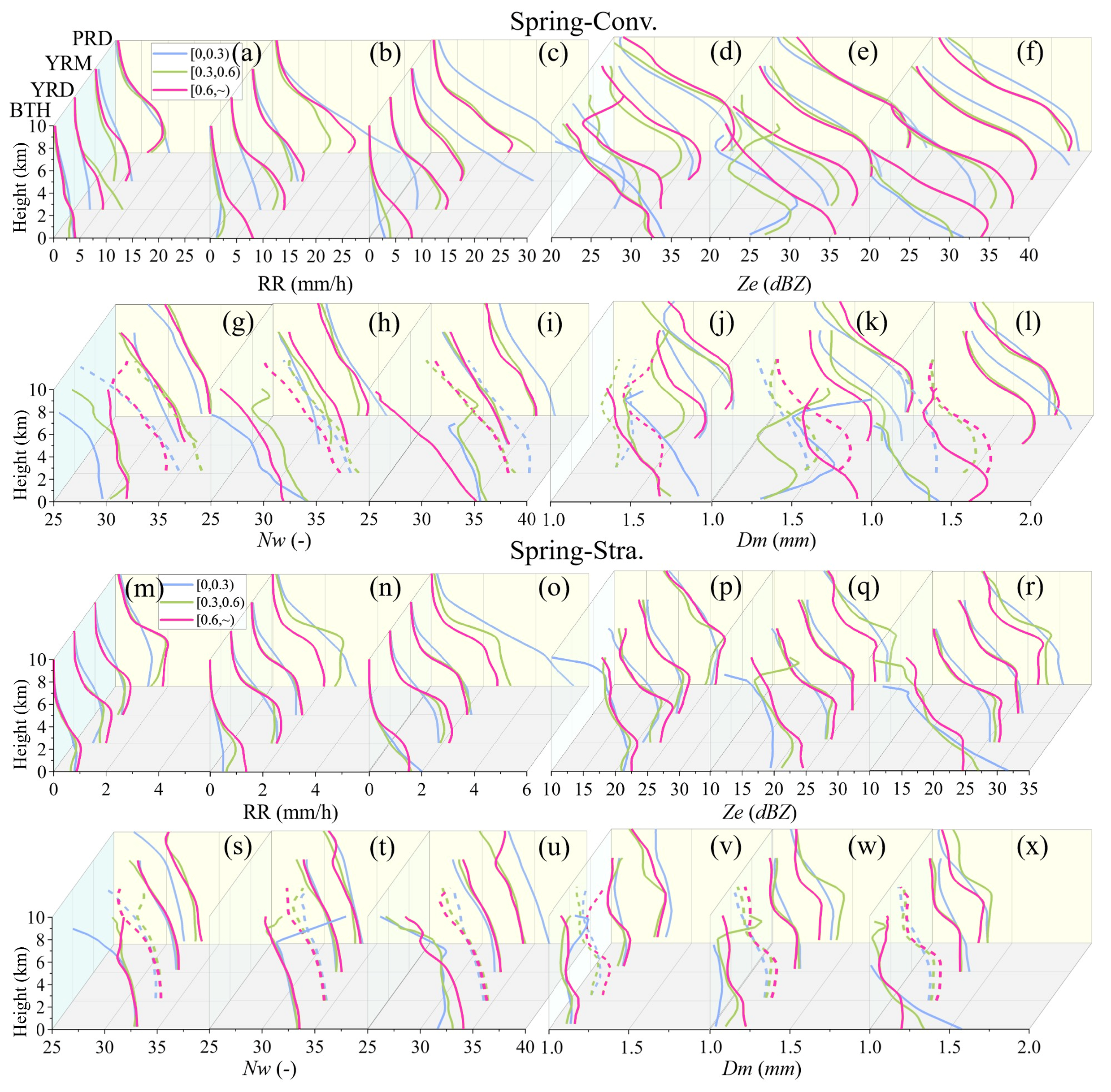 Figure 9Vertical profiles of mean precipitation parameters for convective (a–l) and stratiform (m–x) precipitation in spring across four regions. The profiles are shown under three AOD scenarios and RH conditions (arranged left to right as low, medium, high RH; e.g., panels (a–c) correspond to low, medium, high RH, respectively). To differentiate overlapping curves, selected profiles are plotted as dashed lines while retaining the same representational validity as solid lines.