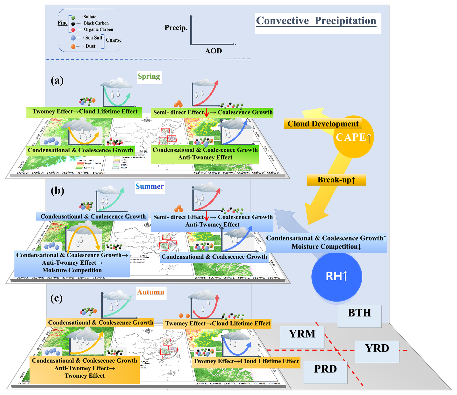 Peng et al. (2025) conducted a focused investigation into the effects of fine and coarse aerosols on summer precipitation processes within the YRD region. The results indicated that coarse aerosols suppress convective precipitation by competing for moisture, whereas fine aerosols enhance precipitation by forming small droplet clusters with condensational and coalescence growth. However, precipitation characteristics vary significantly across different regions and seasons, which can be attributed to differences in aerosol types, concentrations, and meteorological conditions. Therefore, this study integrates precipitation, aerosol, and environmental data from four major urban agglomerations (the BTH, YRD, YRM, and PRD) between 2014 and 2023. A multi-source DPR-MERRA-2-ERA5 dataset was constructed to systematically analyze the impact of aerosol on precipitation properties and microphysical processes. In addition, this study systematically examines how aerosol-precipitation interactions are modulated by thermodynamic and dynamic conditions. This unified methodology facilitates a comprehensive, cross-regional, and cross-seasonal comparison of aerosol impacts on precipitation and cloud microphysics across China's major urban agglomerations.