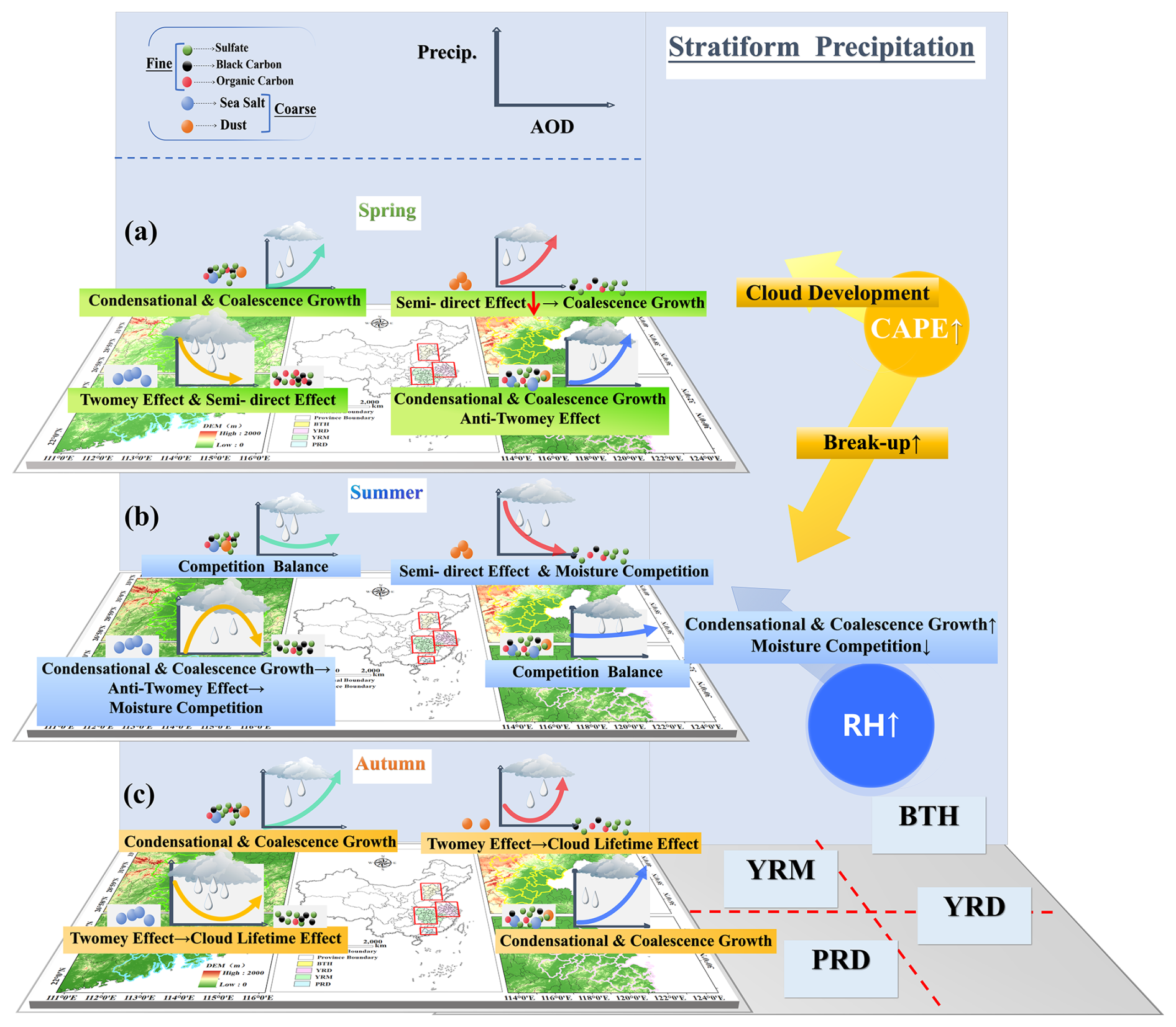 In stratiform precipitation (Fig. 5b), break-up generally exceeds coalescence, with distinct seasonal patterns: in spring, the BTH exhibits increasing-then-decreasing coalescence, whereas the PRD shows the opposite trend (aligning with divergent RR patterns in Fig. S13a). During summer and autumn, BTH consistently shows notably lower break-up than coalescence, which is one of the reasons why precipitation continues to decline with increasing AOD loading in summer. The specific microphysical influence process is explained in detail in Sect. 3.