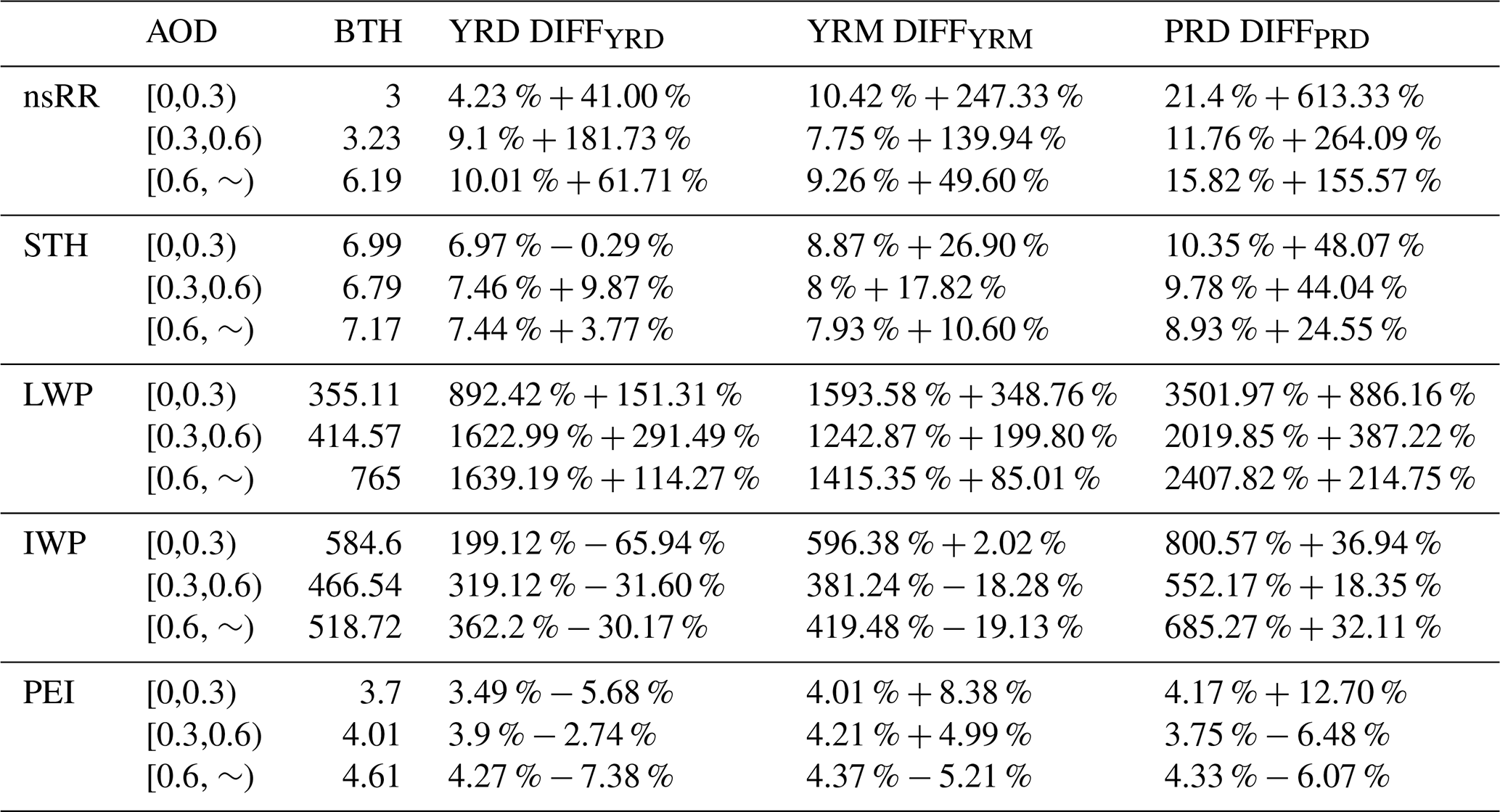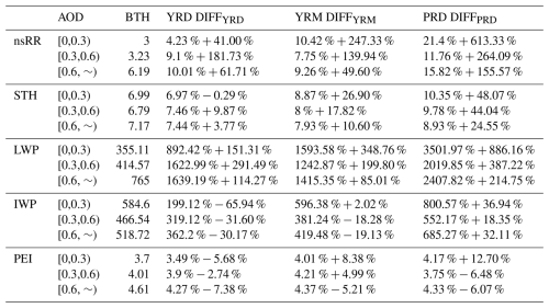 For spring (Fig. S11a–e), the BTH, YRD, and YRM exhibit continuously increasing trends in nsRR, LWP, and IWP with increasing aerosol loading. Conversely, the PRD shows overall decreasing trends across most precipitation parameters. In summer (Fig. S11f–j), the BTH, YRD, and YRM demonstrate linear increases in nsRR and LWP means as aerosol loading rises. However, the PRD exhibits nonlinear trends: initial increases followed by decreases in nsRR, STH, LWP, and IWP means, a pattern consistent with its convective precipitation behavior. In autumn (Fig. S11k–o): monotonically rising trends in nsRR, LWP, and IWP are shown by the YRD and YRM, whereas the BTH and PRD display decreasing and then increasing trends in nsRR, IWP, and PEI, indicating an increase in aerosol loading. Additionally, the fractional changes in stratiform precipitation indicate that an increase in aerosol loading moderately reduces regional disparities during regional normalized difference comparisons, particularly in the spring and summer (Tables S4–S6). For instance, in the PRD region during spring (Table S4), the DIFFPRD values for IWP are 208.16 %, 141.06 %, and 34.13 %, corresponding to AOD ranges of [0,0.3), [0.3,0.6), and [0.6,), respectively. The seasonal normalized differences indicate significant ice-phase processes but weak liquid-phase processes across various regions during spring.To summarize, aerosols influence the average values of precipitation parameters, displaying characteristics that differ across spatiotemporal scales and precipitation types. Furthermore, precipitation parameters exhibit greater regional than seasonal variation. In particular, within the 270 DIFFregion samples, 41 (constituting 15.2 %) exhibited values exceeding 100 %, whereas among the 240 DIFFseason samples, only 10 (representing 4.2 %) demonstrated such a phenomenon (Tables S2–S8). Additionally, convective precipitation shows larger magnitude changes across seasons and regions than stratiform precipitation.