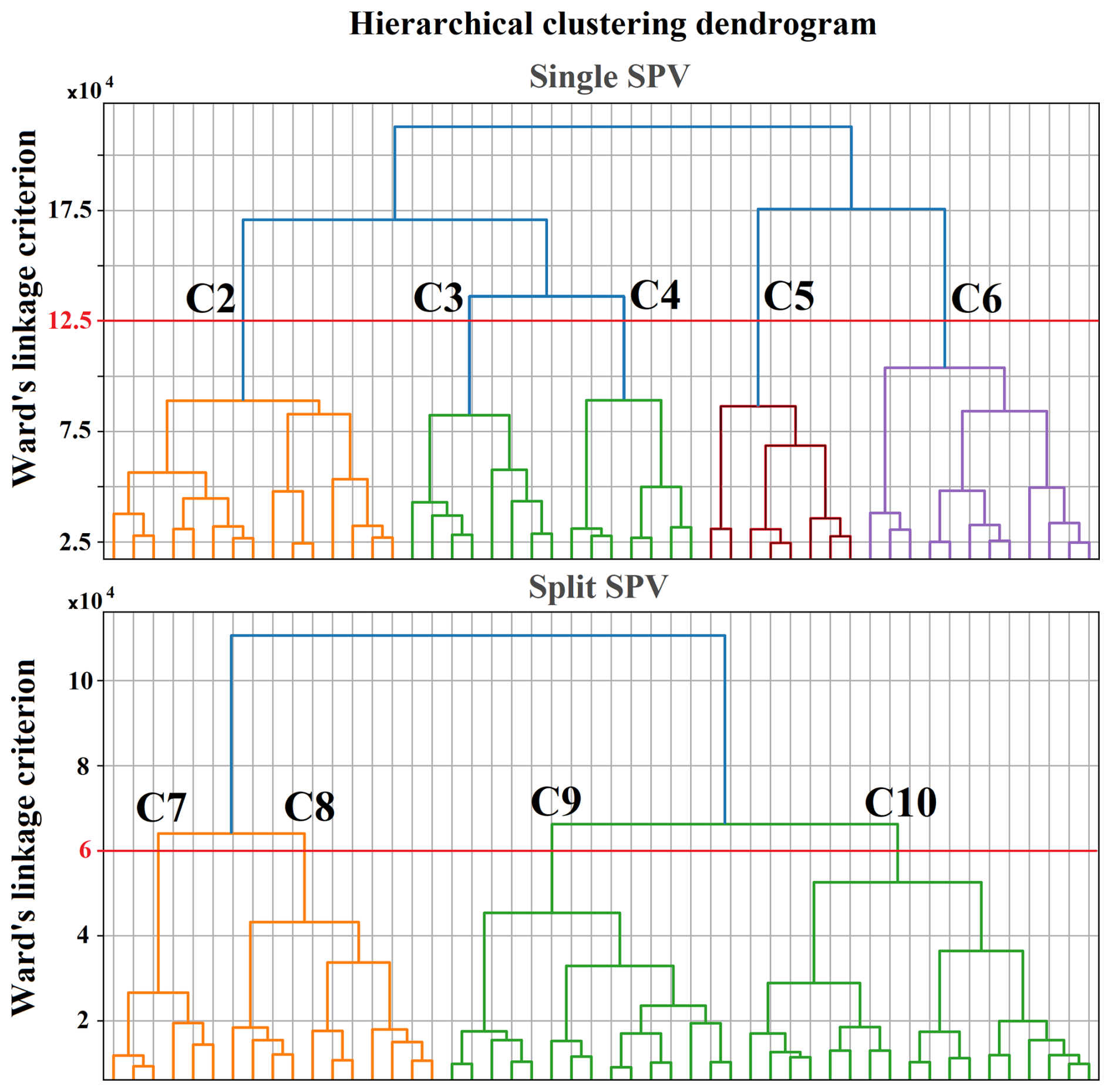 Figure 2Hierarchical clustering dendrograms (Ward, 1963) displaying the last 50 merging steps for the single vortex category (upper panel) and the split vortex category (lower panel). The horizontal axis represents subsets of data points within each cluster branch, while the vertical axis shows Ward's linkage criterion (i.e., the increase in within-cluster variance based on Euclidean pairwise distances in feature space) at which clusters merge. Red horizontal lines in both panels represent thresholds of 12.5×104 (upper panel) and 6×104 (lower panel), which were used to partition the data into five clusters for the single vortex category and four clusters for the split vortex category, respectively. The cluster IDs (C2–C6 and C7–C10) are labeled at the intersection of the branches with the selected thresholds in both panels. Branches are colored (independently in each panel) to distinguish different merging routes and cluster heritage.
