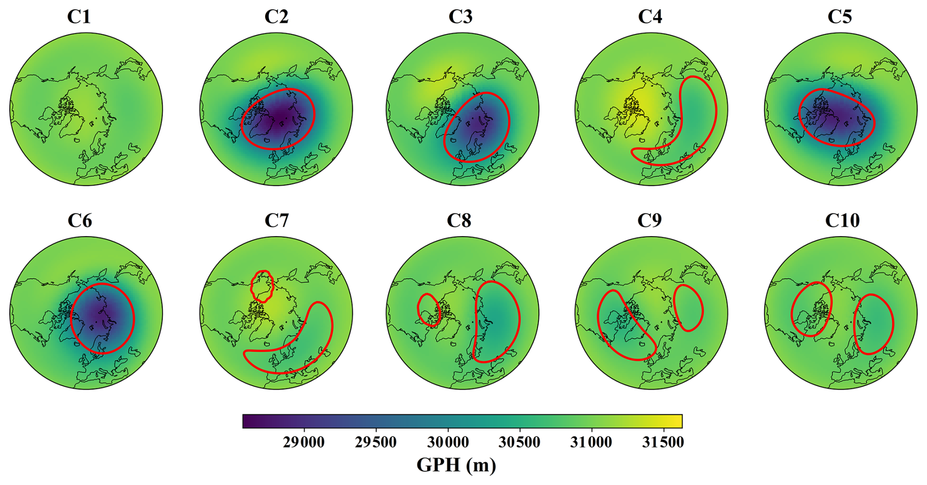 Figure 6Composite 10 hPa GPH fields for SPV classes C1–C10 during the extended winter season (NDJFM), obtained by averaging all daily GPH fields assigned to each cluster across all experiments. Red contours in clusters C2–C10 represent reconstructed vortex boundaries derived from the average feature vectors of all SPV boundary objects associated with each cluster. Cluster C1, which includes unstable or undefined SPV configurations, does not include a reconstructed boundary.