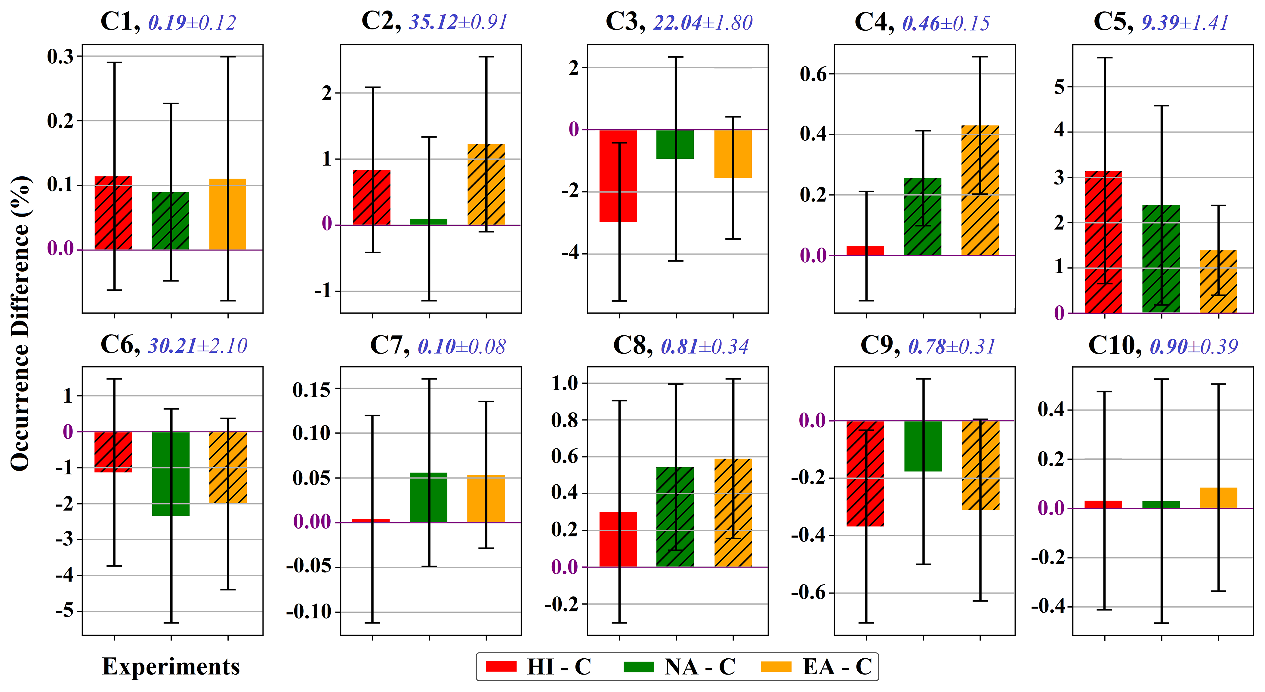 The HI experiment shows a consistent increase in the frequency of C1, C2, and C5, and a consistent decrease in C6 and C9. NA shows consistent increases in C1, C4, C5, and C8. The EA experiment shows consistent increases in C2, C4, C5, and C8, and consistent decreases in C6 and C9. Cluster C3 exhibits a mean decrease in all experiments but does not show ensemble consistency in any case.