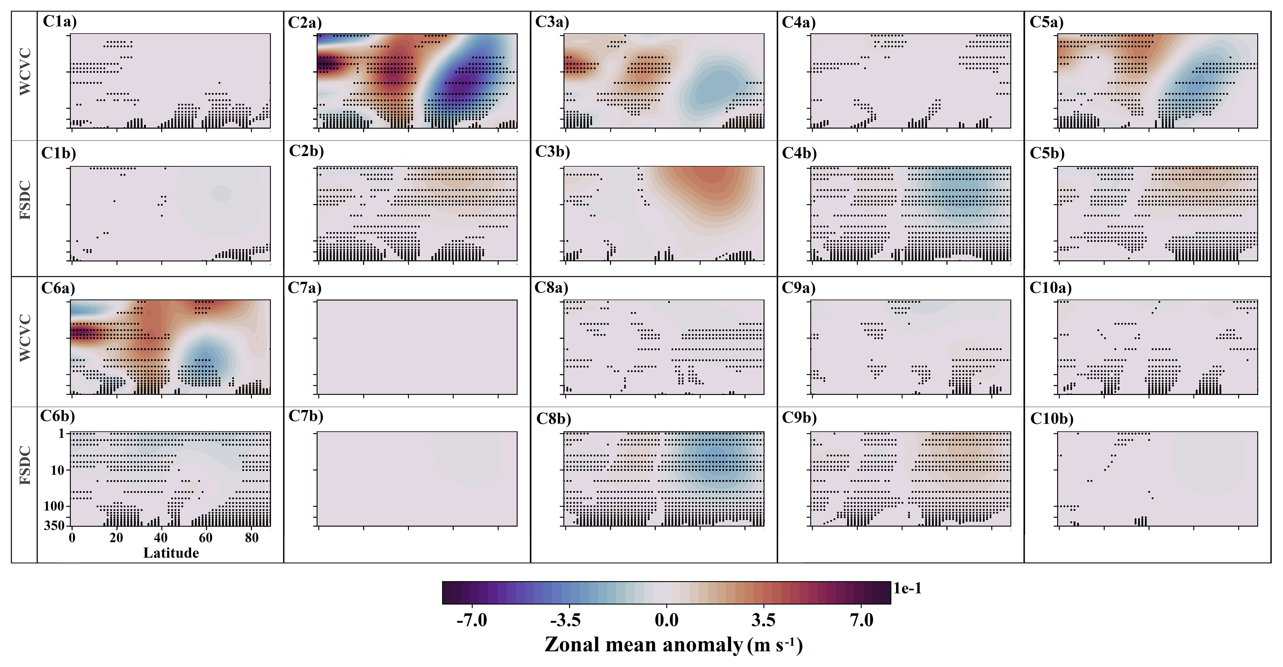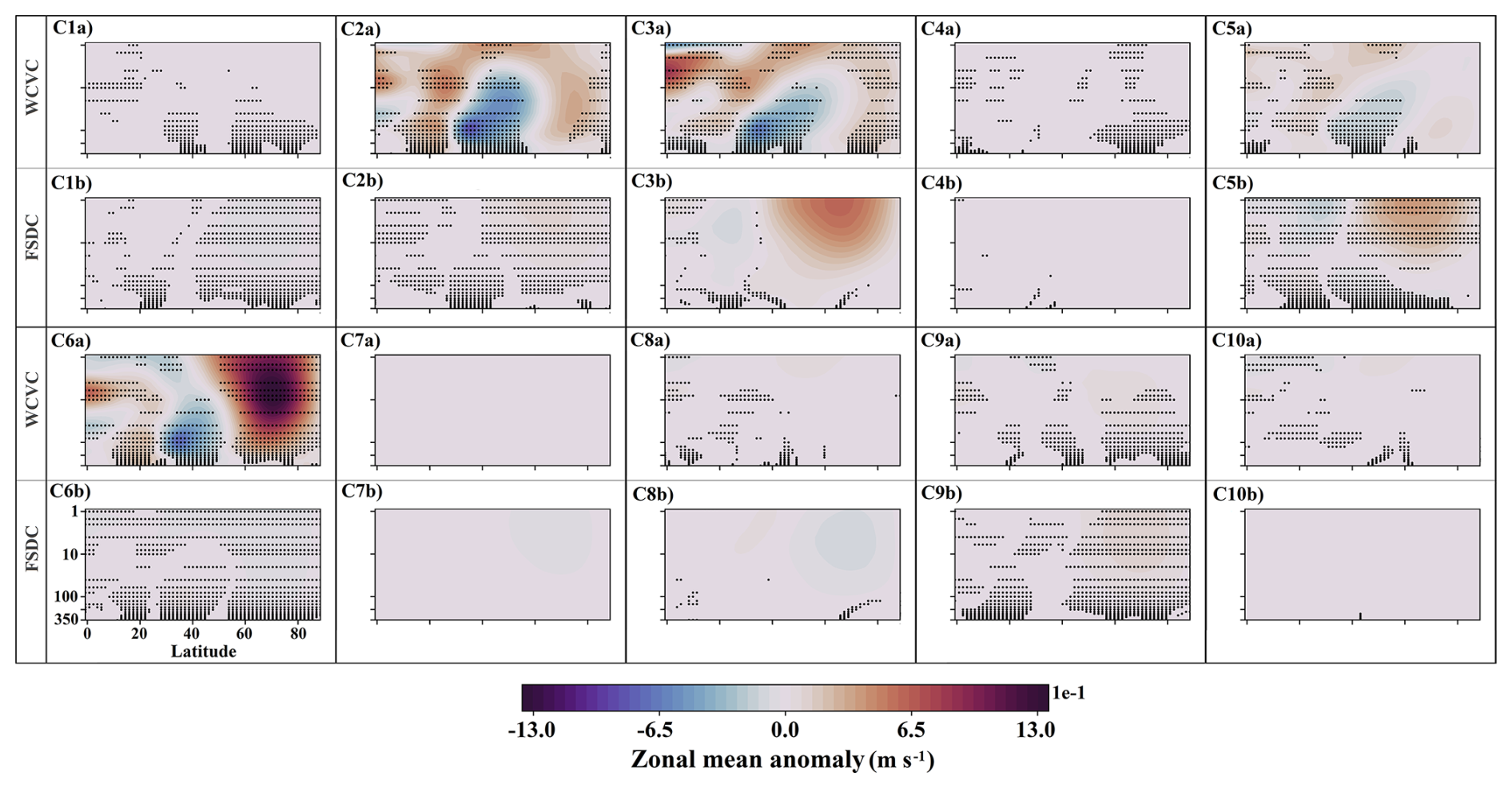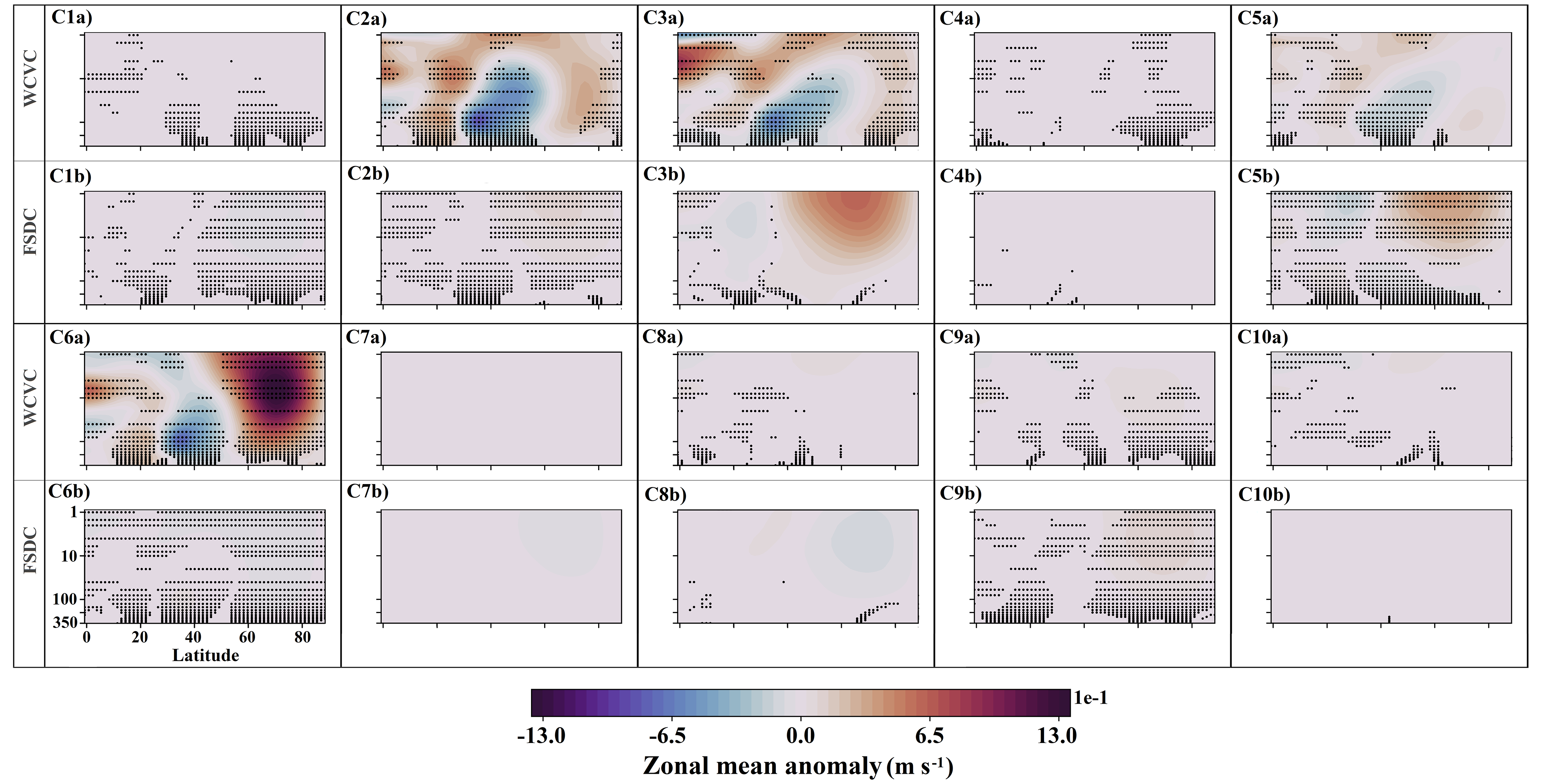 Figure 13 shows the class contributions to the EP flux divergence anomaly in the NA experiment (see Fig. 5e). The increased frequencies of C4, C5, and C8 (see Fig. 7) provide modest but consistent positive contributions in the high-latitude upper stratosphere via their FSDC components (panels C4b, C5b, and C8b). The WCVC component of C2 contributes consistently to positive EP flux divergence anomalies from the high-latitude lower stratosphere into the midlatitude upper stratosphere (panel C2a). Contributions from the other clusters are generally not consistent across ensemble members.
