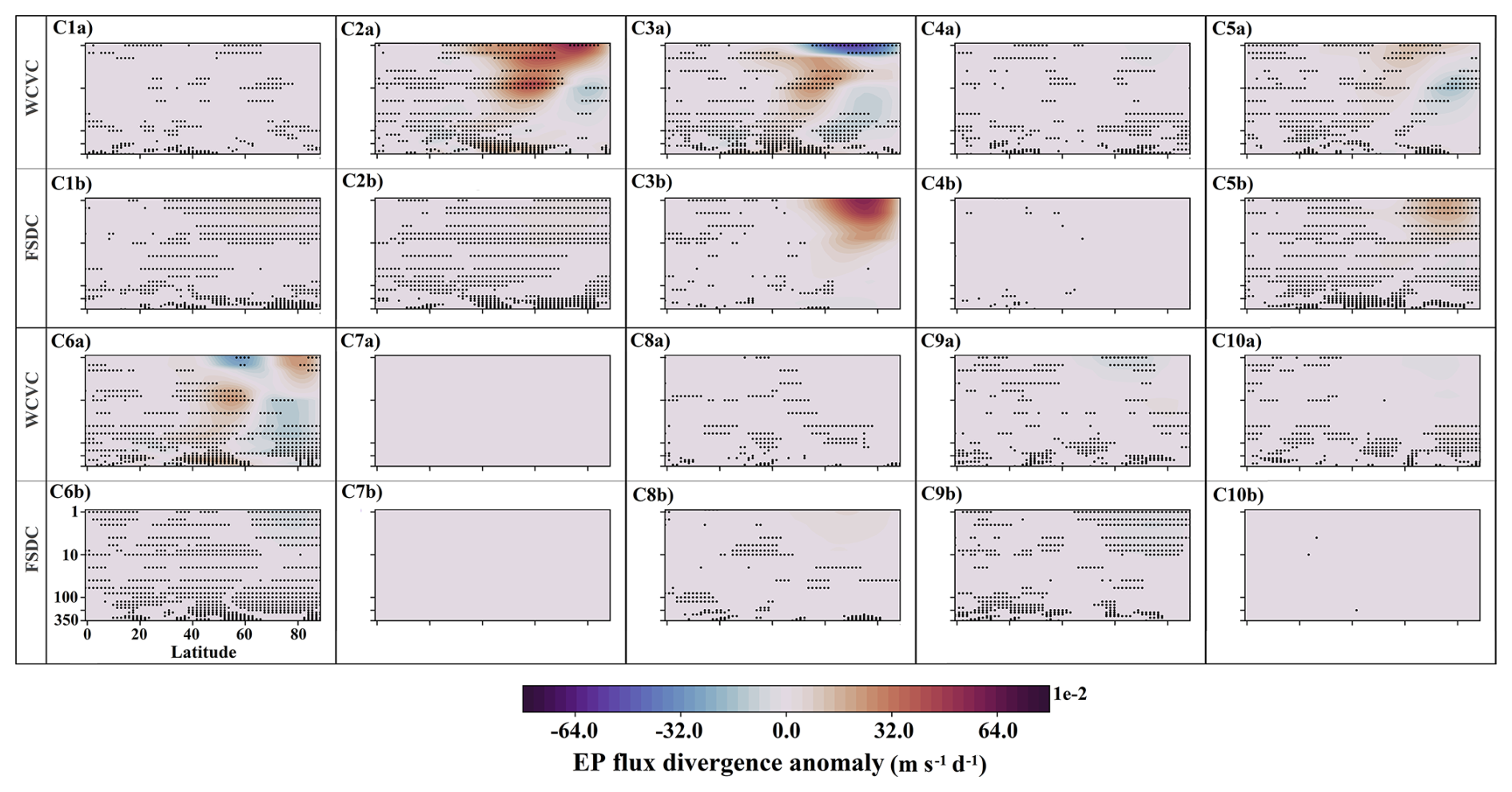 Figure 10 shows the class contributions to EP flux divergence anomalies, as presented in Fig. 5d. The WCVC component of C2 produces positive anomalies in the midlatitude middle and upper stratosphere, indicating reduced wave drag (panel C2a). C3 and C6 contribute modestly to similar positive anomalies through their WCVC components, while also enhancing wave drag in the high-latitude lower and middle stratosphere (panels C3a and C6a). The increased frequency of C5 (see Fig. 7) yields a consistent positive contribution in the high-latitude upper stratosphere via its FSDC component (panel C5b). C3's FSDC also contributes positively in this region, although inconsistently across ensemble members.
