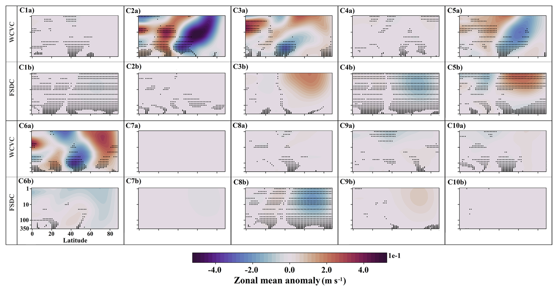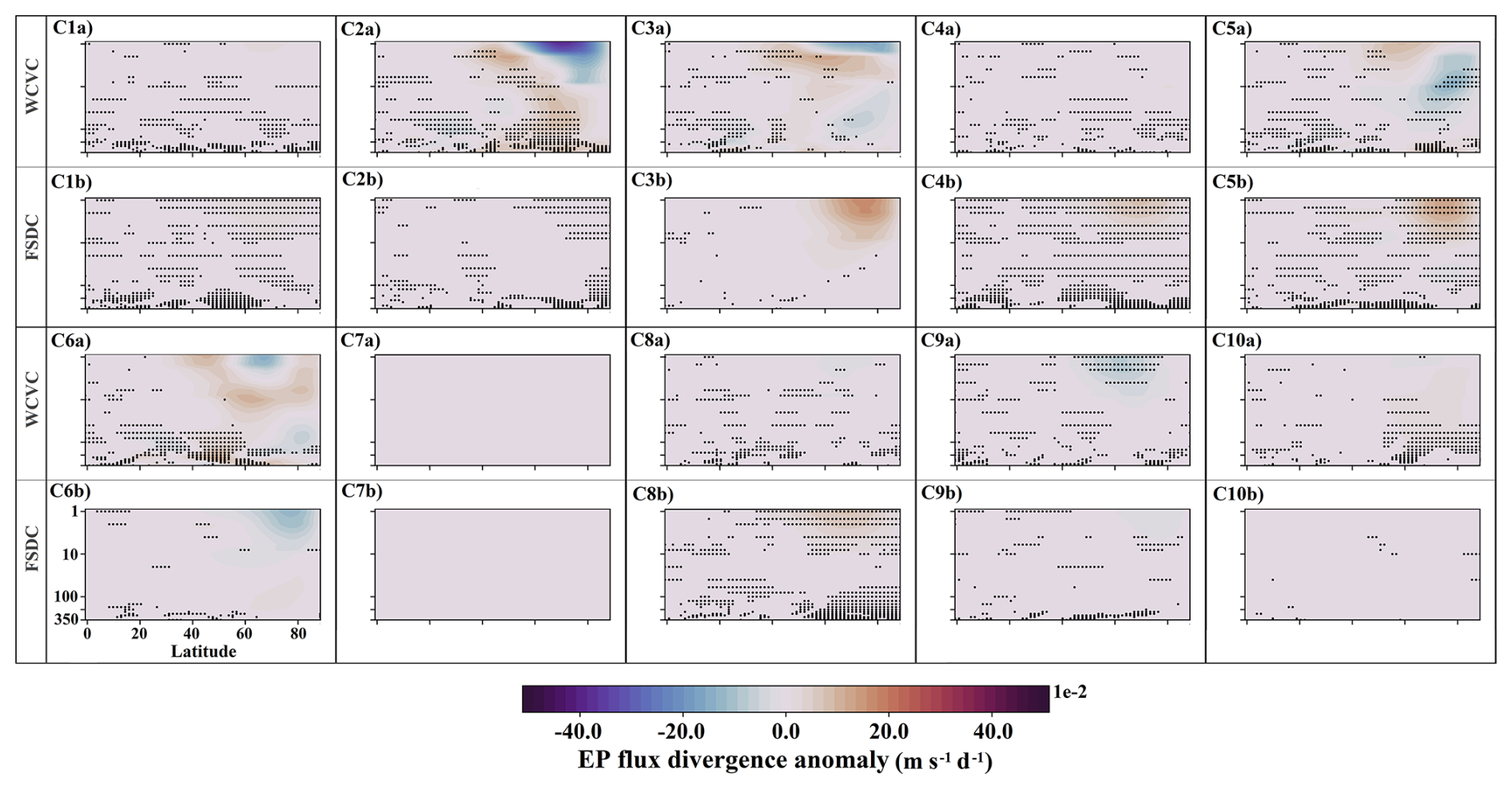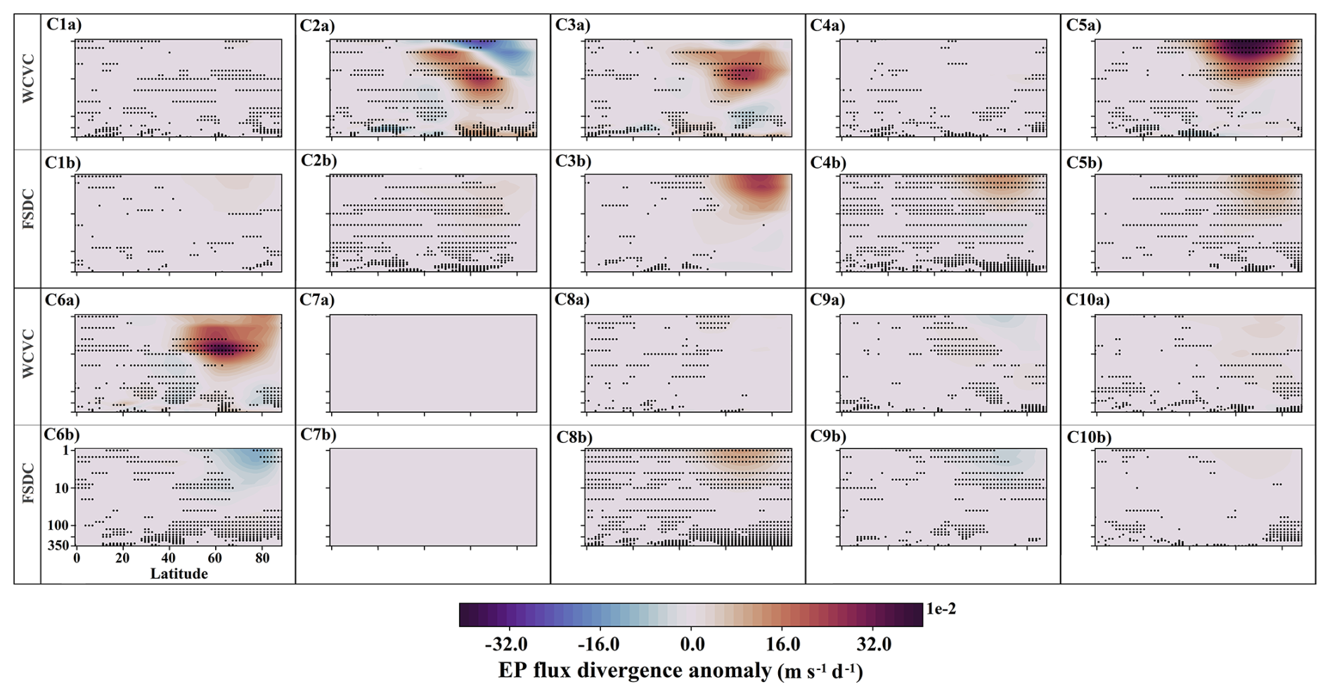 Figure 16 shows the class contributions to the EP flux divergence anomaly in the EA experiment (see Fig. 5f). The increased occurrence frequencies of C2, C4, C5, and C8 in EA (see Fig. 7) produce modest but consistent positive anomalies in the high-latitude upper stratosphere via their FSDC components (panels C2b, C4b, C5b, and C8b), whereas the decreased occurrence of C9 contributes a modest negative anomaly through FSDC (panel C9b). The WCVC component of C5 is the primary contributor to the positive EP flux divergence anomalies in the high-latitude upper stratosphere (panel C5a). In addition, the WCVC components of C6, C3, and C2, listed in order of decreasing strength, also contribute consistently to positive anomalies in the middle and upper stratosphere (panels C6a, C3a, and C2a).