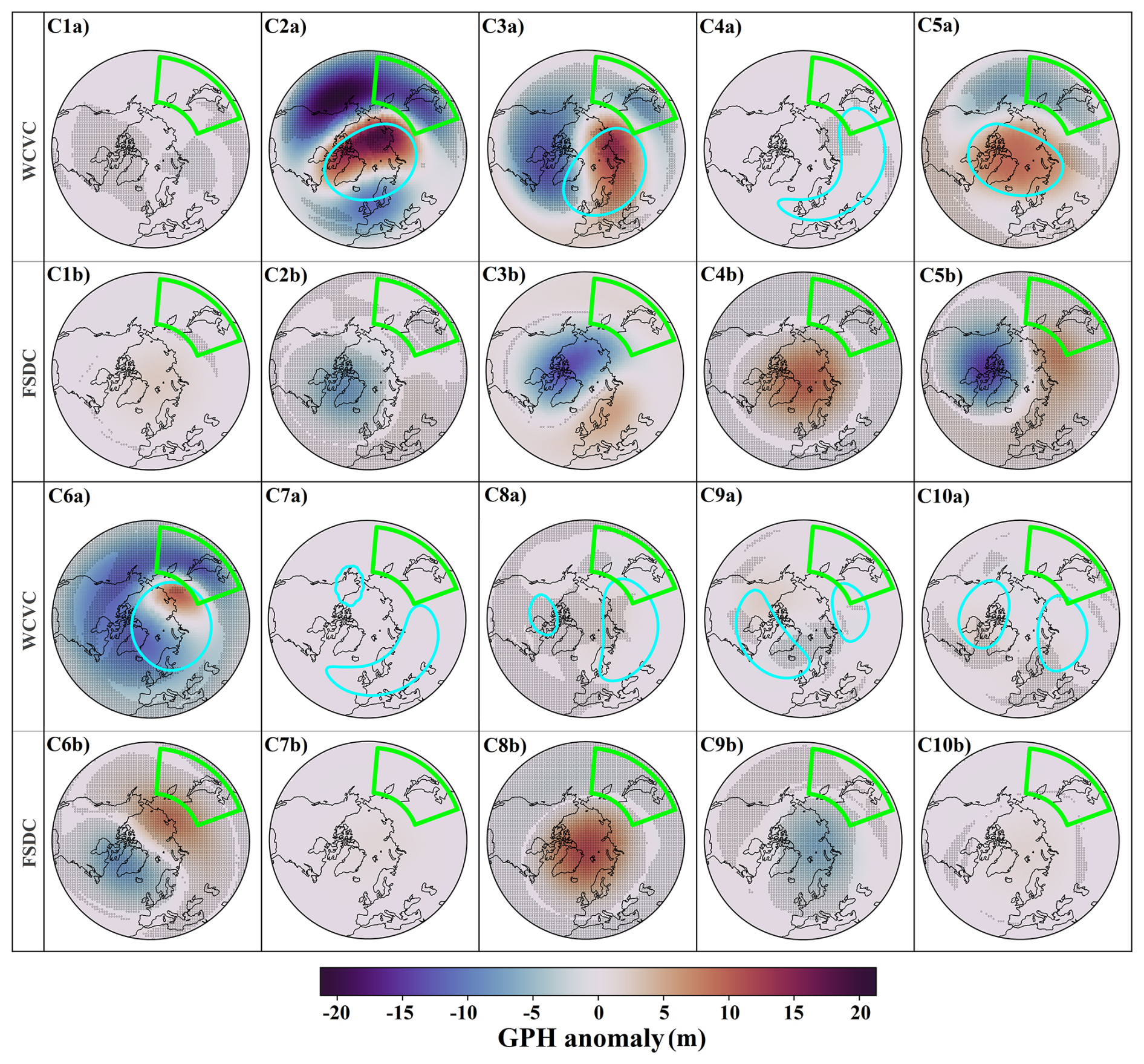 Figure 8Class contributions to the 10 hPa GPH anomaly for the HI experiment. Each panel (e.g., C1a/C1b to C10a/C10b) corresponds to one SPV class. For each class, the top sub-panel (a) shows the Within-Cluster Variability Contribution (WCVC), and the bottom sub-panel (b) shows the Frequency-weighted Seasonal Deviation Contribution (FSDC). For each SPV cluster, the mean boundaries shown in Fig. 6 are also overlaid with cyan contours in the WCVC sub-panels. Dotted areas indicate regions where the class contribution is consistent across at least five out of six ensemble members. The green outline marks the forced region in the HI experiment.