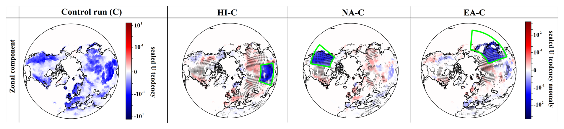 To investigate the impact of regionally intensified orographic GW forcing, we conducted a control simulation (C) and three sensitivity experiments. The control run used the default model configuration. In the sensitivity experiments, the GW drag produced by the SSO scheme (Lott and Miller, 1997) was enhanced by a factor of 10 in three GW hotspot regions – the Himalayas (HI), Northwest America (NA), and East Asia (EA) – while the low-level component of the SSO drag, associated with flow blocking and wake effects, remained unchanged. The forced regions are defined as follows: EA spans 30–60° N and 110–175° E; NA spans 30–60° N and 100–130° W; and HI spans 25–45° N and 70–100° E. Each experiment, including the control run, comprises a six-member ensemble of 30-year simulations under identical boundary conditions. The ensemble members were generated by perturbing the initial conditions. A concise summary of the exerted SSO zonal drag across hotspots is provided in Appendix A (Figs. A2 and A1). For full details on the model configuration, ensemble design, and GW forcing strategy, see Mehrdad et al. (2025a) and the accompanying publicly available datasets (see Code and data availability section).
