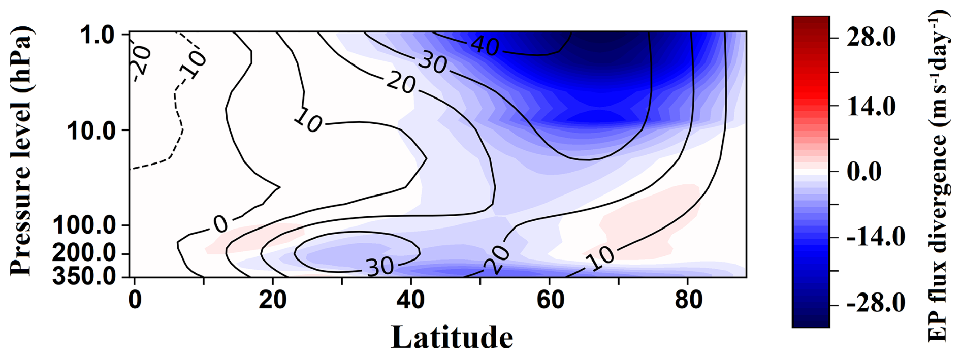 To characterize the stratospheric polar vortex, we used the geopotential height (GPH) field at the 10 hPa level. These GPH fields were interpolated onto a Lambert azimuthal equal-area projection centered on the North Pole (Snyder, 1987), using a horizontal grid spacing of 1.5°, which closely matches the native resolution of the model. We also used temperature and horizontal wind fields to derive zonal-mean quantities and Eliassen–Palm (EP) flux and its divergence (Andrews et al., 1987).