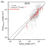 Table 5The correlation coefficients (R) and power exponents (Exponent) of the linear fittings between measured sulfuric acid concentration and the estimated ones using proxies in this study, the relative errors (RE) of the estimated sulfuric acid concentrations to the measured one, as well as the ratios of proxy concentrations to measured concentration using mean ([Proxy/Measured]mean) and median ([Proxy/Measured]median) values.