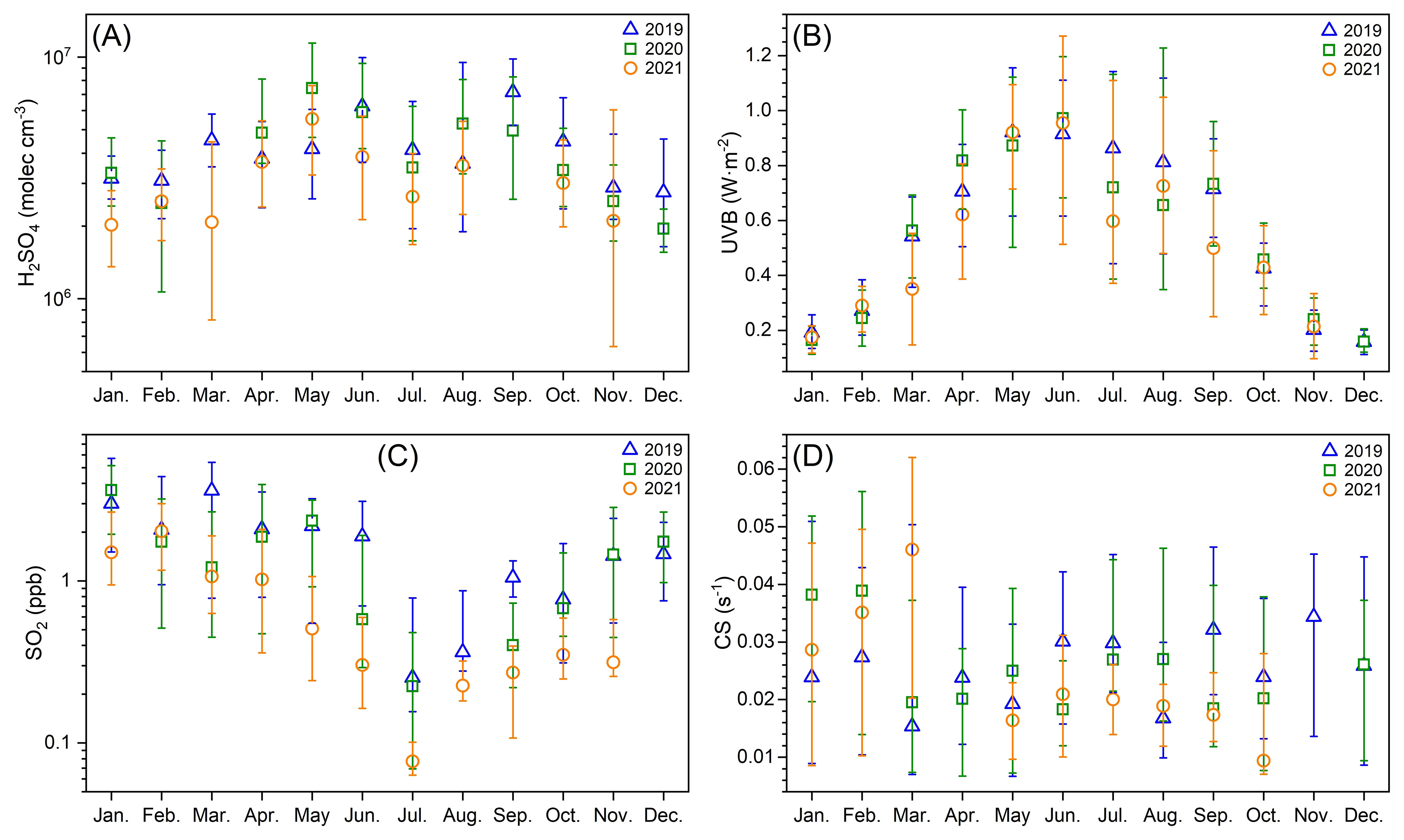 Figure 1Three-year (from January 2019 to November 2021) monthly variations of (a) H2SO4 concentration, (b) UVB, (c) SO2 and (d) condensation sink (CS) during daytime (10:00–14:00 LT) when new particle formation mostly occurs. Blue triangles, green squares and orange circles represent data in 2019, 2020 and 2021, respectively. The up line, middle marker and bottom line stand for upper quartile, median and lower quartile values, respectively.