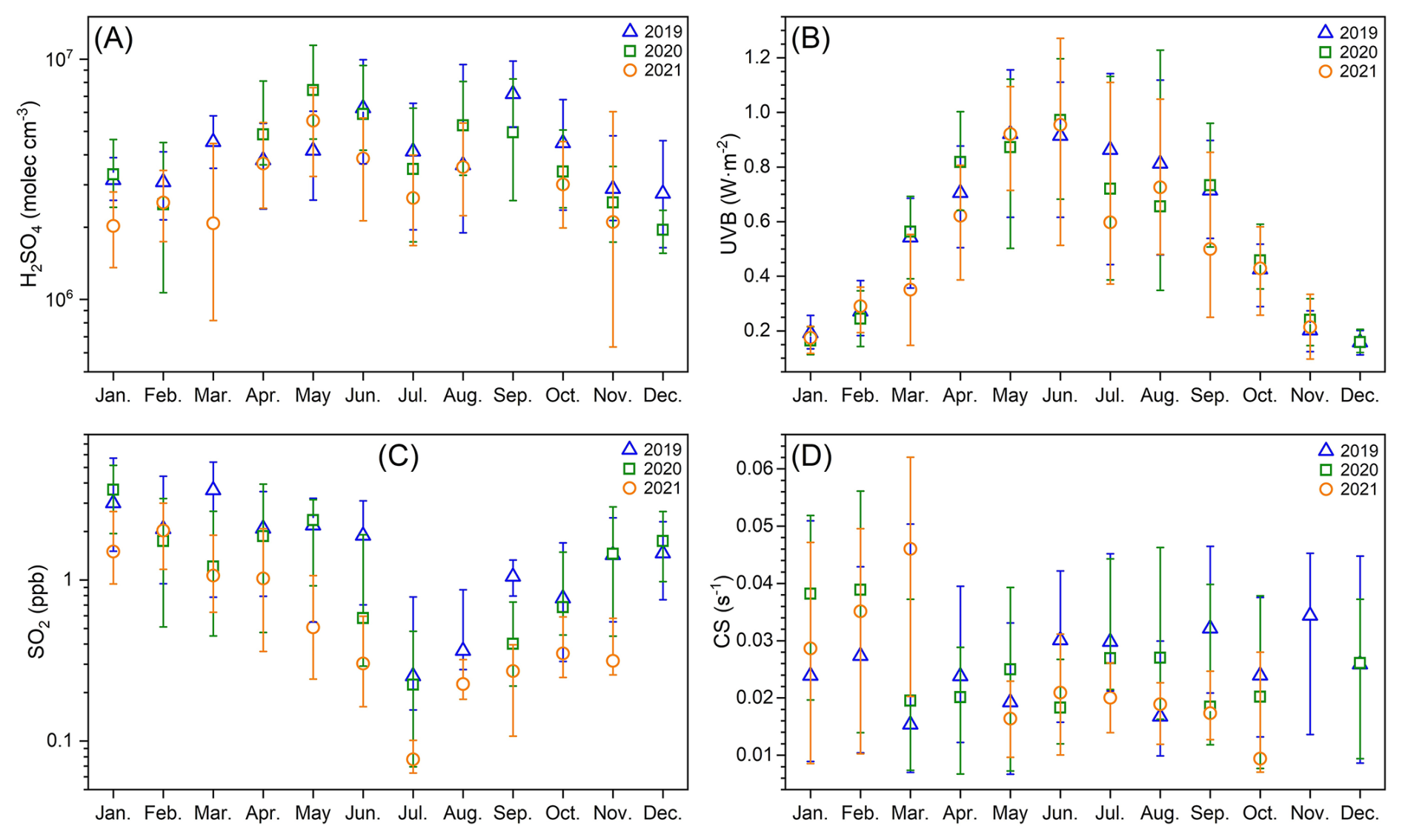 In urban Beijing, typical daytime sulfuric acid concentration ranges from 2.0×106 to 7.4×106 molec. cm−3 (monthly median concentration, Fig. 1a and Table 2). Figures 1a and S1e in the Supplement show that sulfuric acid concentration generally declines from 2019 to 2021, with an average annual decrease of 14 %. During the three years, UVB intensity remains roughly constant (Figs. 1b and S1a), CS change is not significant (Figs. 1d and S1e), while SO2 concentration decreases markedly (Figs. 1c and S1d). Thus, the yearly decline of sulfuric acid is mainly attributed to the decrease of SO2 (by ∼25 % yr−1, Table S8). Figure 1a also reveals that sulfuric acid concentration has a clear seasonal variation, which is the highest in May (4.2–7.4×106 molec. cm−3) and September (5.0–7.2×106 molec. cm−3) and the lowest from November to February of the next year (2.0–3.3×106 molec. cm−3). UVB shows the same monthly pattern as sulfuric acid, which reaches the highest from May to September and decreases to the lowest from November to February of next year, while SO2 shows an opposite monthly trend to sulfuric acid. This indicates that the influence of UVB on sulfuric acid monthly variation outperforms that of SO2. Meanwhile, sulfuric acid concentration in July is much lower from May to September, likely driven by extremely low SO2 despite a small decrease of UVB in that month. In Beijing, precipitation occurs more frequently in July and August than in May, June and September (Table S1 in the Supplement). This reduces UVB and SO2 in these two months (Fig. S2), and further leads to lower sulfuric acid concentration. Overall, UVB intensity and SO2 concentration are the two key parameters determining sulfuric acid concentration.