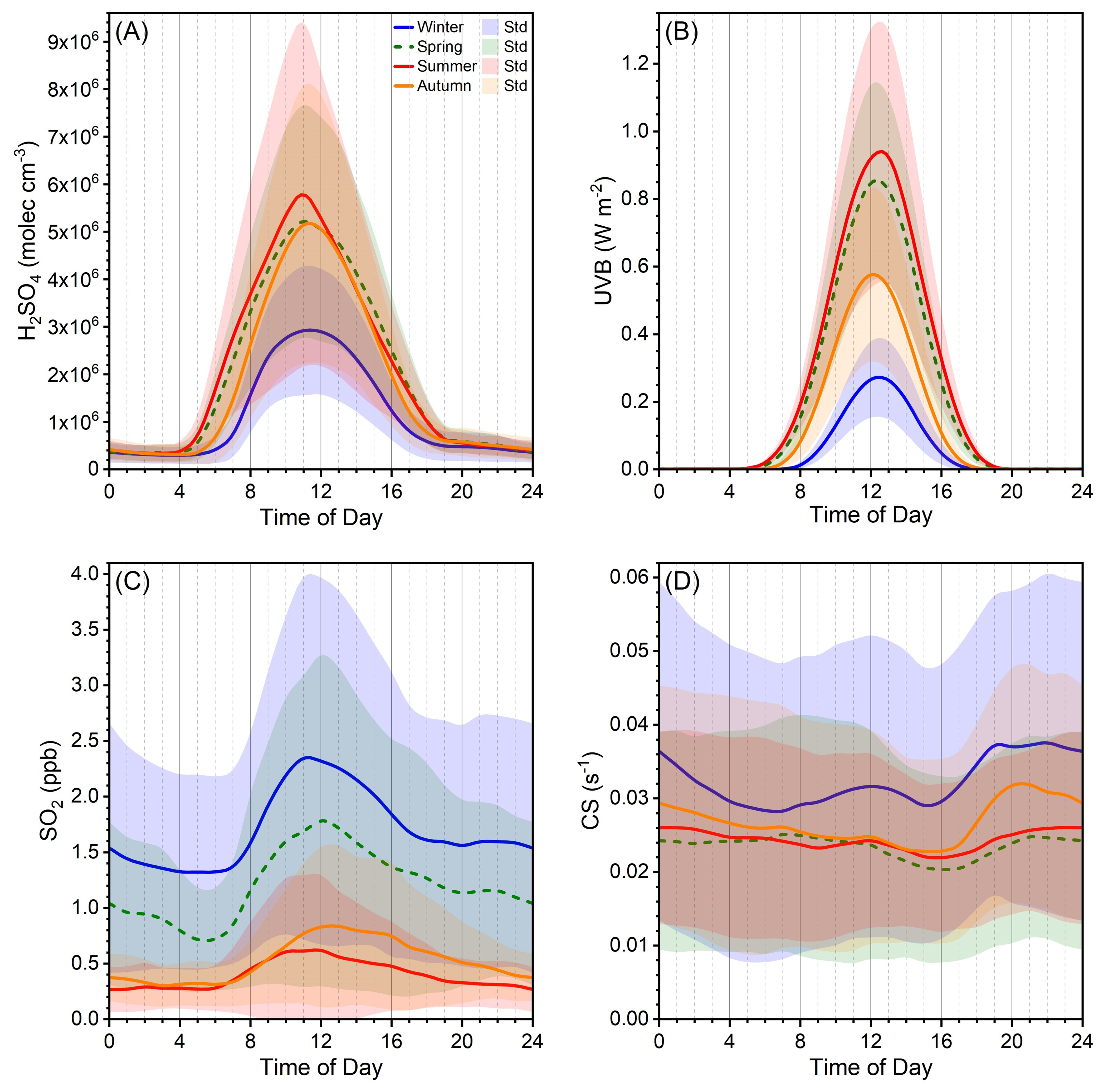 Figure 2Three-year (from 2019 to 2021) diurnal variations of (a) H2SO4, (b) UVB, (c) SO2 and (d) condensation sink (CS). Winter, spring, summer and autumn periods cover 15 November to 15 March of next year, 16 March to May, June to August, and September to 14 November, respectively. Lines are the mean values, and shaded areas denote the standard deviations of the data.
