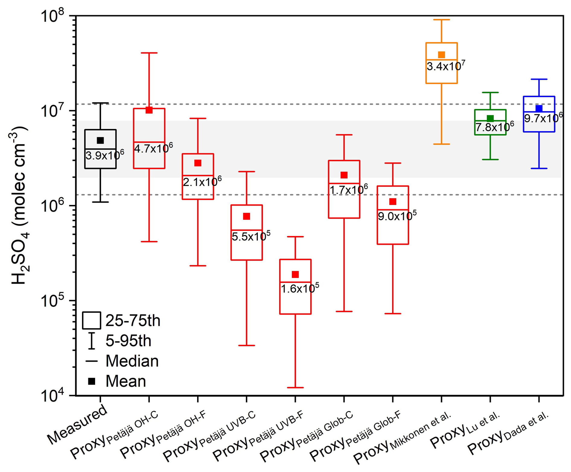 Figure 3Sulfuric acid concentrations from measurement and estimated by proxies from literatures during the time window of 10:00–14:00 LT in 2019 (1 January to 31 December). Black value inside each box is the median concentration. “ProxyPetäjä OH–C” “ProxyPetäjä OH–F” “ProxyPetäjä UVB–C” “ProxyPetäjä UVB–F” “ProxyPetäjä Glob–C” and “ProxyPetäjä Glob–F” represent sulfuric acid proxies from the work of Petäjä et al. (2009), with P1 proxy using OH radical with constant pre-factor k1, P1 proxy using OH radical with fitted pre-factor k1, P2 proxy using UVB with constant pre-factor k2, P2 proxy using UVB with fitted pre-factor k2, P3 proxy using global radiation with constant pre-factor k3, and P3 proxy using global radiation with fitted pre-factor k3, respectively. “ProxyMikkonen etãl.” “ProxyLu et al.” and “ProxyDada et al.” are sulfuric acid proxies from the work of Mikkonen et al. (2011), Lu et al. (2019) and Dada et al. (2020), respectively. Gray area covers 50 % to 200 % of median concentration of measured sulfuric acid, and two gray lines cover 33.3 % to 300 % of median concentration of measured sulfuric acid.
