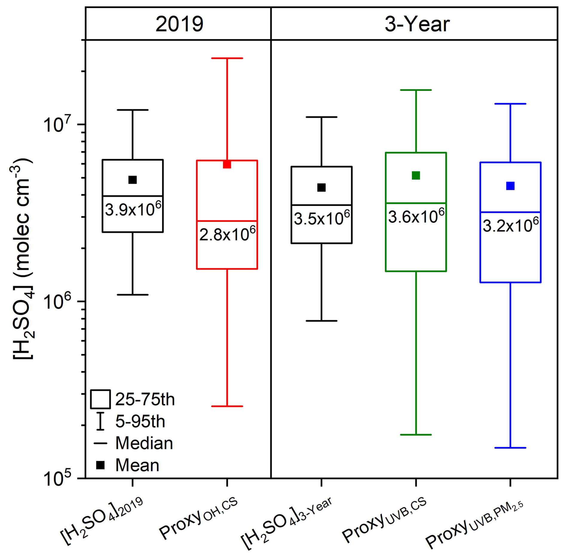 Figure 4 shows the overall concentrations of measured and estimated sulfuric acid from proxies. The estimated sulfuric acid concentrations from three proxies are generally in good agreement with the measured one, although the OH–CS-based proxy yields slightly lower concentration than measurement. Additionally, the concentration ranges estimated by proxies are broader than the measured one. Detailed sulfuric acid concentrations, including mean, standard deviation, median, lower quartile and upper quartile values are summarized in Table S4.