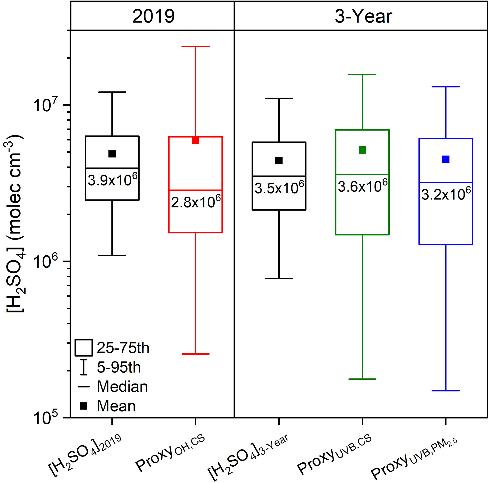To have better understanding on the performance of sulfuric acid proxies at any given moment, the time variations of sulfuric acid concentrations from three proxies and measurement are shown in Figs. S8 and S9. Generally, the OH–CS based proxy provides a good estimation on daytime sulfuric acid concentration (Fig. S8). Specifically, in 2019, the concentration estimated by this proxy matches well with the measured one in January, February, March, April, August, and September. In other months of 2019, it underestimates or overestimates sulfuric acid concentration. This shows that although the OH–CS-based proxy generally performs well, sulfuric acid concentration at a given moment may deviate. Similarly, sulfuric acid concentrations estimated by UVB–CS based and UVB–PM2.5 based proxies generally match well with the measured one at most of the daytime, with deviations noticeable in several months over 3 years (Figs. S8 and S9). These time variations are consistent with the findings in Sect. 3.1.2: the daily peak width of OH–CS based proxy is narrower than that of measured sulfuric acid, and the daily peak widths of UVB–CS based and UVB–PM2.5 based proxies are narrower than that of OH–CS based proxy. Furthermore, the OH–CS based proxy partially reproduces the formation of sulfuric acid at night and early morning, with evidence on most days of January 2019 and some days of February 2019. Although UVB–CS based and UVB–PM2.5 based proxies cannot estimate nighttime sulfuric acid, they provide a convenient, reliable and, more importantly, feasible way to trace the long-term daytime sulfuric acid concentration for sites without OH radicals.