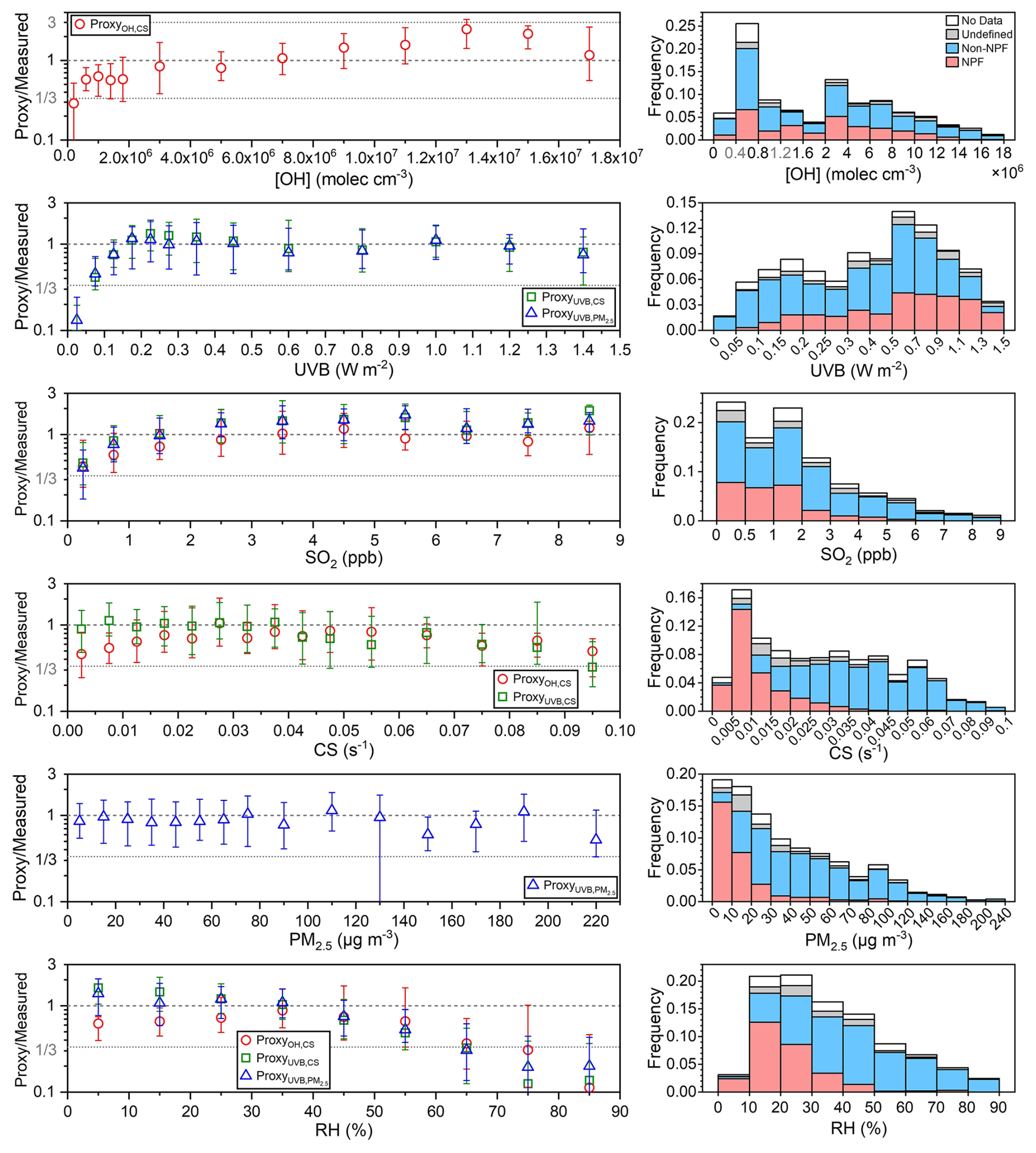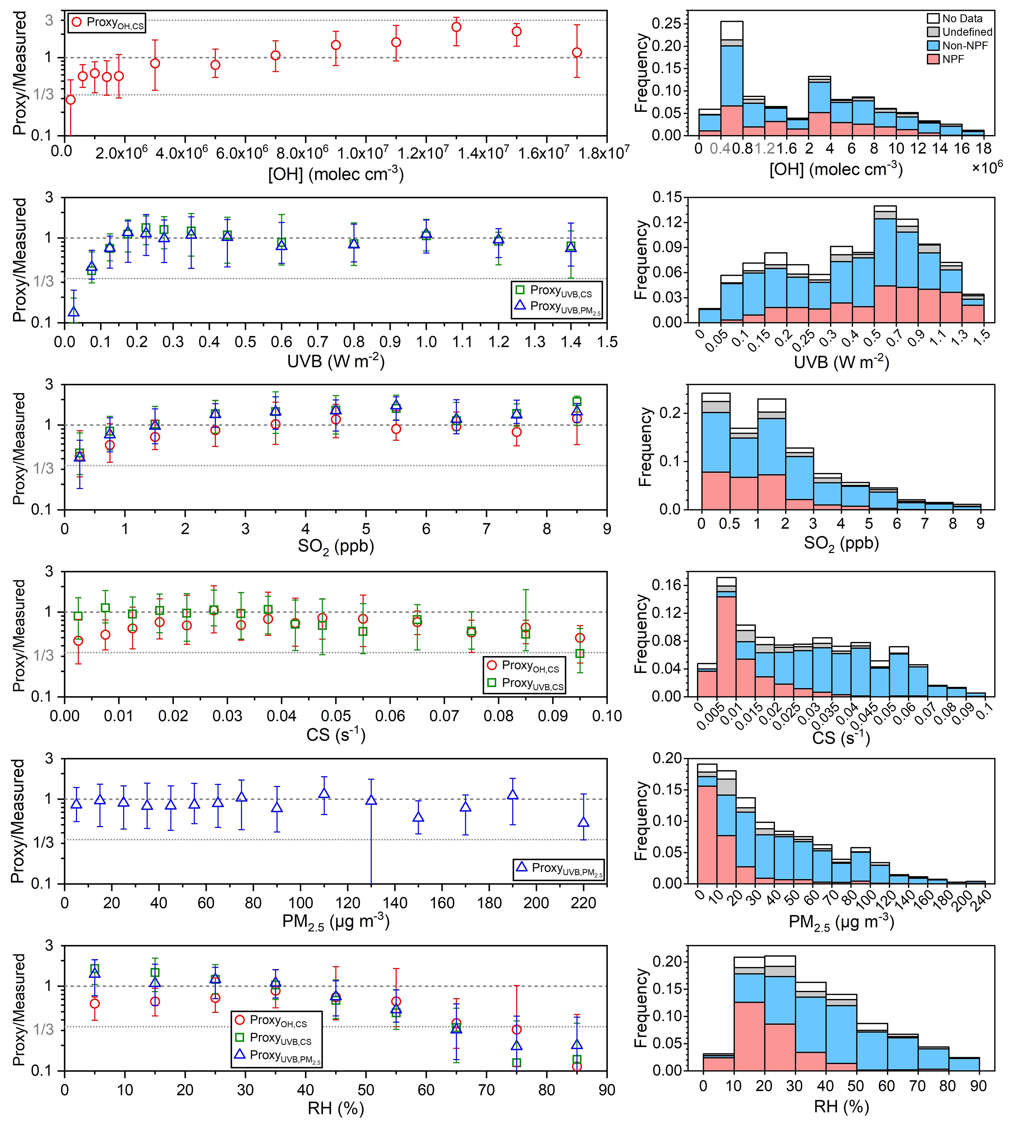 Figure 6Left panels: the ratios of sulfuric acid concentrations estimated by proxies in this study to the measured one (Proxy/Measured) vs. concentration of OH radical ([OH]), UVB, SO2, CS, PM2.5 and RH during daytime (10:00–14:00 LT) of 2019. Different colored markers represent different proxies. The up line, middle marker and bottom line stand for upper quartile, median and lower quartile values respectively. Right panels: frequency distributions of corresponding parameters classified by “NPF”, “Non-NPF”, “Undefined”, and “No Data” periods.