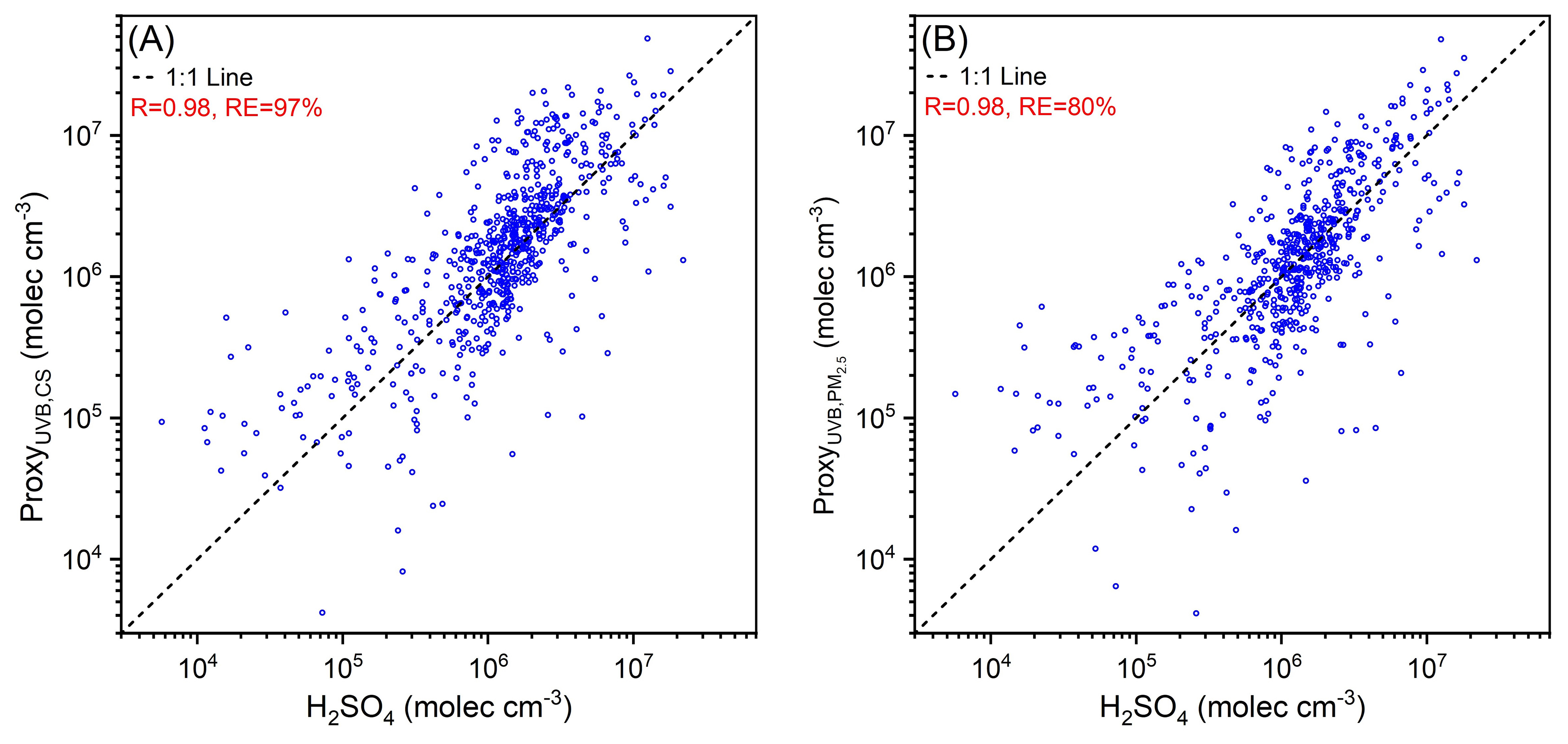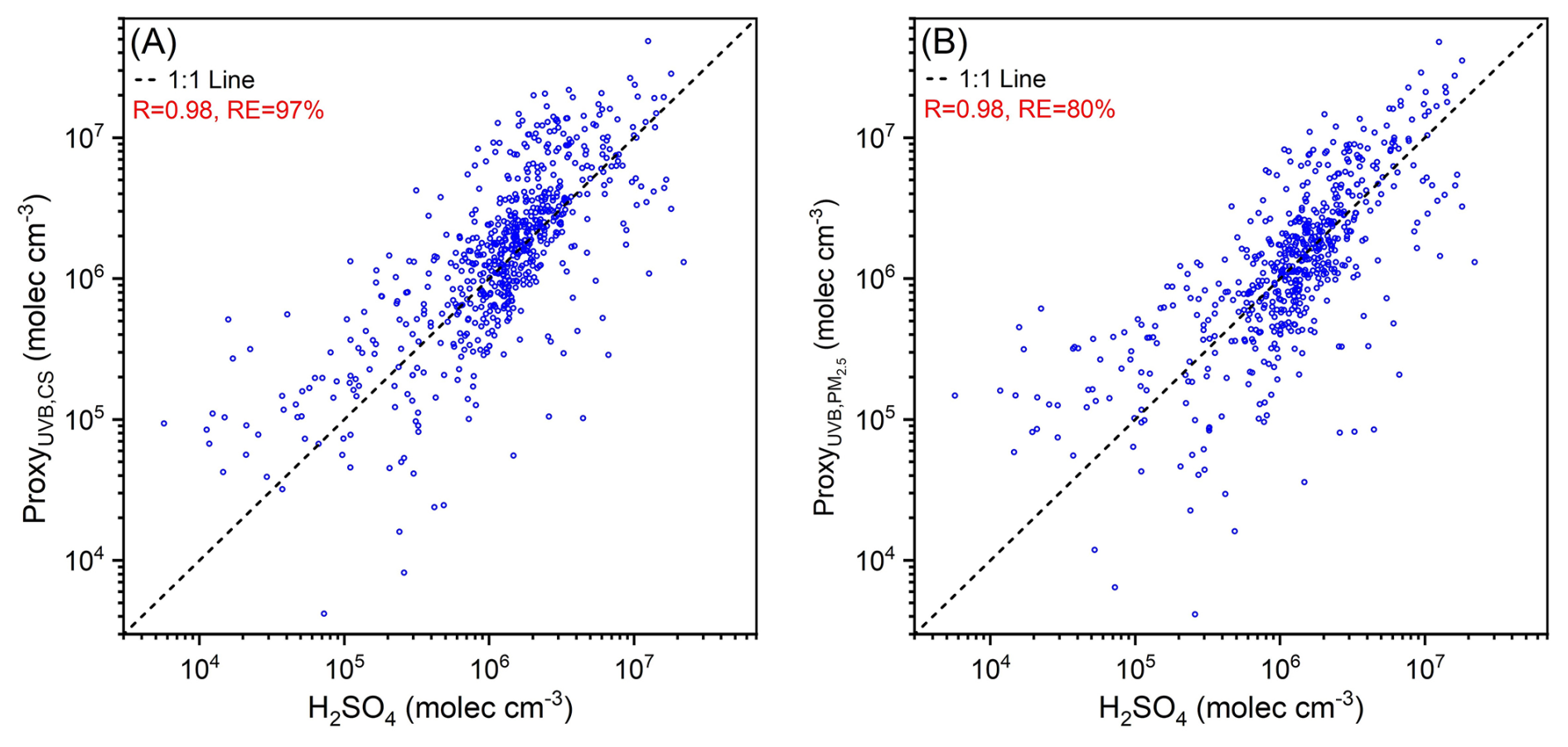 Figure 7(a) UVB–CS based proxy (ProxyUVB,CS) and (b) UVB–PM2.5 based proxy (Proxy) vs. measured sulfuric acid of Hyytiälä, Finland during daytime (10:00–14:00 LT) from 8 March to 13 August 2018. The pre-factor of ProxyUVB,CS (kUVB,CS) is W−1 m2 s−1, which is the same as Beijing. The pre-factor of Proxy () is µg W−1. In both two plots, the black dashed lines are 1:1 lines. Correlation coefficients (R) and the relative errors (RE) are shown in the legend.