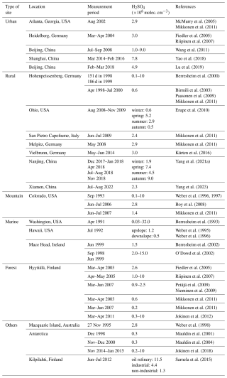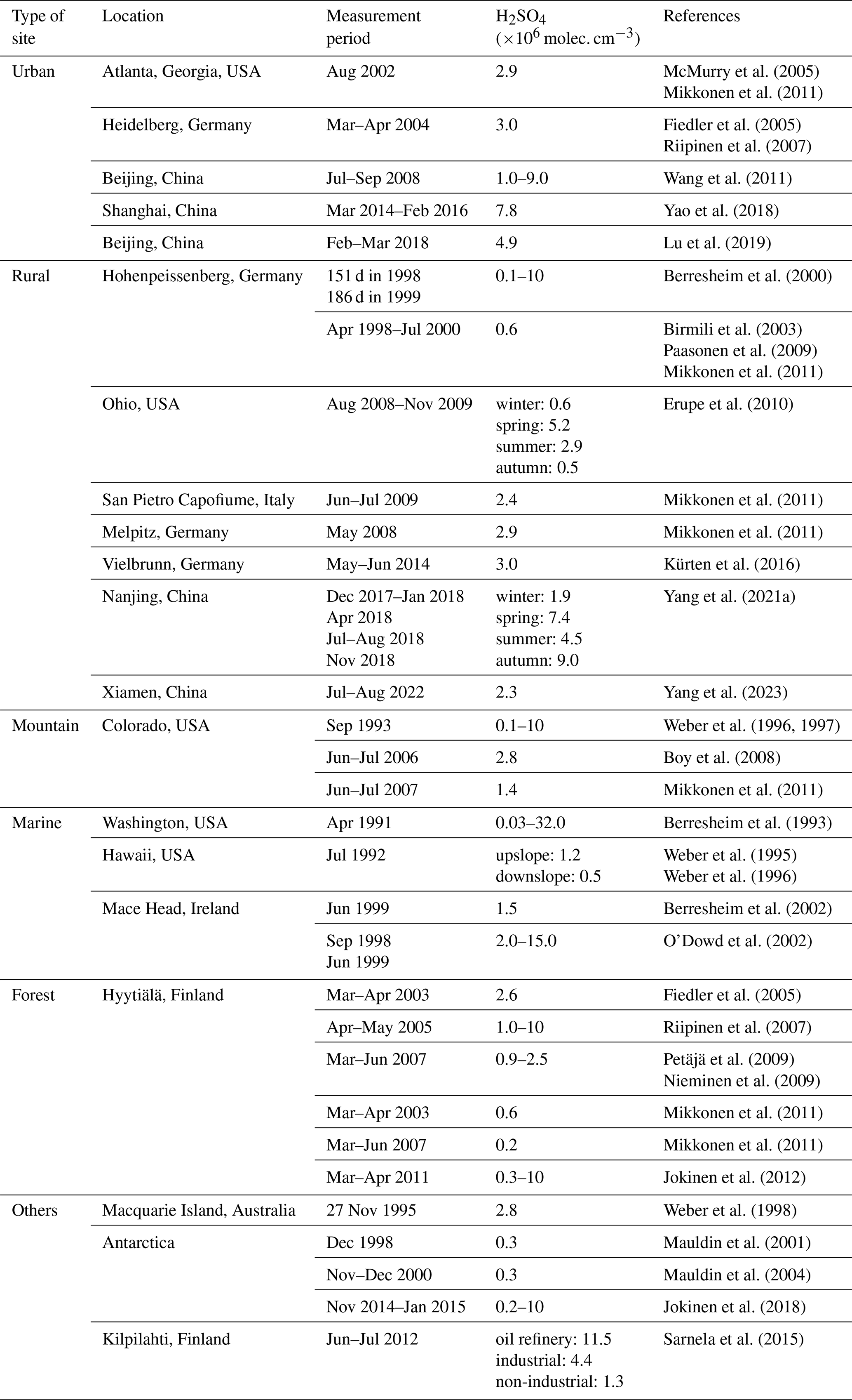 Since the 1990s, sulfuric acid measurements have been conducted in various field campaigns that covered a wide range of atmospheric environments, including urban (McMurry et al., 2005; Fiedler et al., 2005; Riipinen et al., 2007; Mikkonen et al., 2011; Wang et al., 2011; Yao et al., 2018; Lu et al., 2019), rural (Berresheim et al., 2000; Birmili et al., 2003; Paasonen et al., 2009; Erupe et al., 2010; Mikkonen et al., 2011; Kürten et al., 2016; Yang et al., 2021a, 2023), mountainous (Weber et al., 1996, 1997; Boy et al., 2008; Mikkonen et al., 2011), marine (Berresheim et al., 1993, 2002; Weber et al., 1995, 1996; O'Dowd et al., 2002), forest environments (Fiedler et al., 2005; Riipinen et al., 2007; Petäjä et al., 2009; Nieminen et al., 2009; Mikkonen et al., 2011; Jokinen et al., 2012), among others (Weber et al., 1998; Mauldin et al., 2001, 2004; Sarnela et al., 2015; Jokinen et al., 2018). The locations of these sites, measurement periods, and corresponding sulfuric acid concentrations are summarized in Table 1. In general, within the planetary boundary layer, sulfuric acid concentration was around 0.2–15×106 cm−3, with the highest levels in urban areas, followed by rural, mountainous, and marine regions, and the lowest in forest areas. This suggests that sulfuric acid levels depend strongly on the intensity of human activity. In addition, most measurement campaigns lasted for less than four months and concentrated mostly on warmer seasons (spring, summer and early autumn) when NPF usually occurs (Dal Maso et al., 2005; Manninen et al., 2009; Dada et al., 2017; Nieminen et al., 2018; Chu et al., 2019; Qi et al., 2015). Previous studies showed that NPF in Chinese megacities was also frequently observed in winter (Deng et al., 2020; Chu et al., 2019), and thus sulfuric acid measurement in cold seasons is also crucial. To date, however, long-term measurement of sulfuric acid worldwide is still lacking, which somewhat limits the investigation of NPF processes.