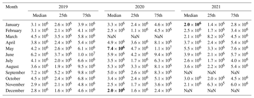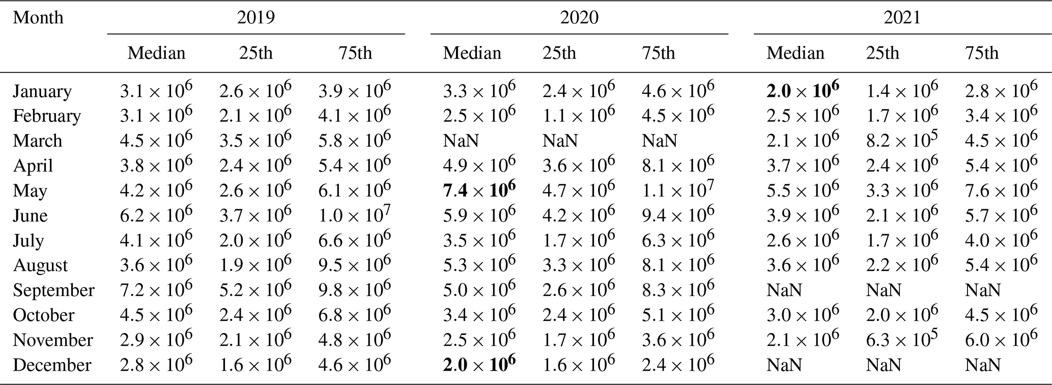 Table 2Monthly concentration of H2SO4 (molec. cm−3) during daytime (10:00–14:00 LT) from 2019 to 2021. “NaN” means there is no data available. Bold values denote the highest or lowest monthly median concentrations.