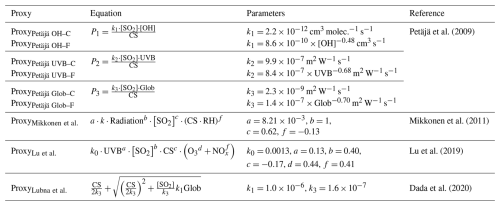 Note that the scaling factor k1 of the OH-based proxy was obtained by replacing the left hand side of the equation with measured sulfuric acid concentration (Petäjä et al., 2009). Thus, k1 was not derived from the chemical production pathways of sulfuric acid, and the best-fit value of k1 may vary from site to site. This limitation restricts its applicability across a broader range of sites. Therefore, in this study, we aim to derive a proxy based entirely on the formation and loss pathways of sulfuric acid, where the parameters, related pre-factors and exponents all have chemical and physical meanings. Proxies of this kind should be applicable across different sites, since no site-dependent scaling factors or exponents are used.