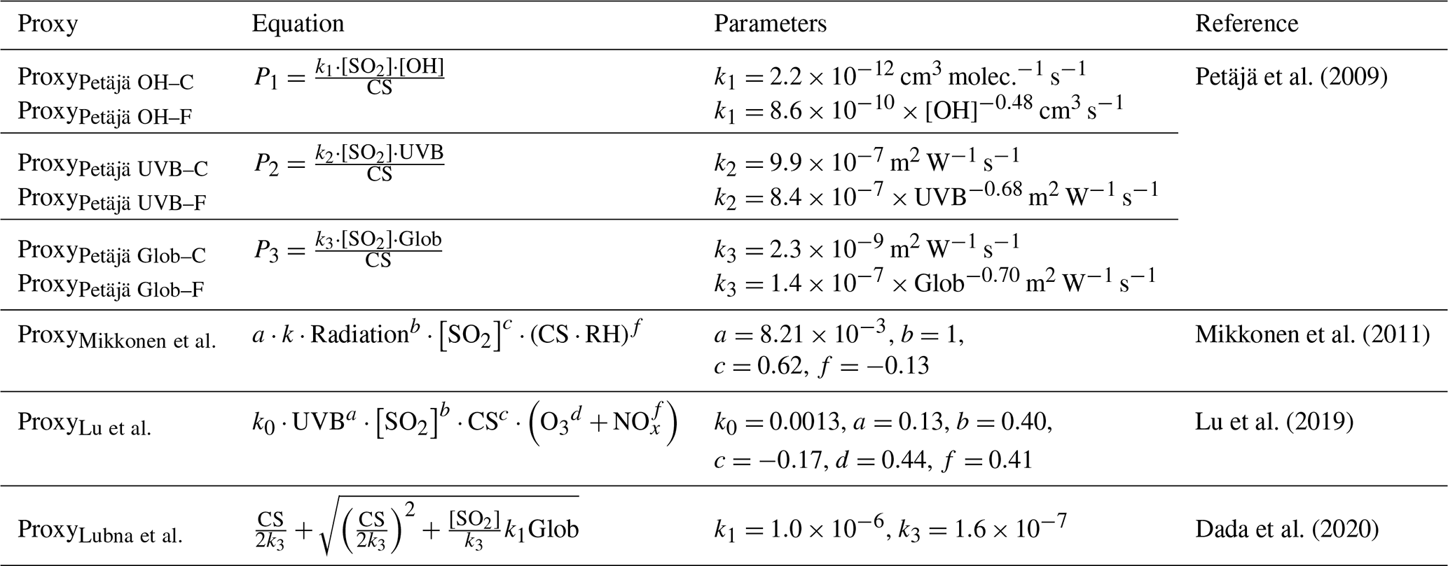 Here, is the rate constant of SO2 oxidation by OH adical. It is taken as cm3 s−1, where T is the temperature in Kelvin (Wine et al., 1984; Atkinson et al., 2004), [SO2] and [OH] are concentrations of SO2 and OH radical in molec. cm−3, and CS is condensation sink of sulfuric acid in s−1. Compared with the proxy proposed by Petäjä et al. (2009), the pre-factor is not obtained by parameter fitting but is a verified reaction coefficient derived from experiments. Therefore, this proxy is chemically meaningful and has the potential to be used at various sites.