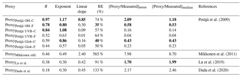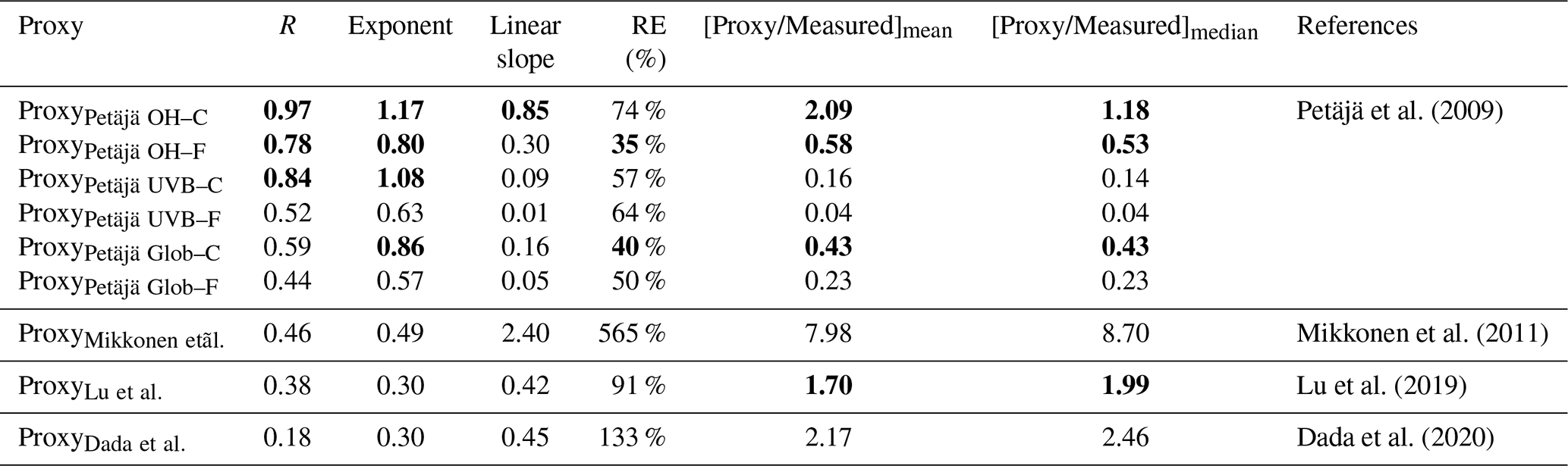 As shown in Fig. 3 and Table 4, estimated sulfuric acid concentrations from ProxyPetäjä OH–C, ProxyPetäjä OH–F and ProxyLu et al. are closest to the measured one, with median deviations within twofold. This suggests that these three proxies provide the best estimates of sulfuric acid concentration. Estimated sulfuric acid concentrations from ProxyPetäjä Glob–C and ProxyDada et al. are not too far away from the measured one, with median deviations within threefold. While estimated concentrations from other proxies differ substantially from the measured one, especially ProxyPetäjä UVB–F, which underestimates sulfuric acid concentration markedly. The linear correlation coefficients of ProxyPetäjä OH–C, ProxyPetäjä OH–F and ProxyPetäjä UVB–C proxies are closet to 1.0. Similarly, the power exponents of ProxyPetäjä OH–C, ProxyPetäjä OH–F, ProxyPetäjä UVB–C and ProxyPetäjä Glob–C are closet to 1.0. This indicates that the estimated sulfuric acid from former three proxies have the best linear correlation with the measurement. Only the slope of ProxyPetäjä OH–C (0.85) is close to 1.0, suggesting that it performs the best in linear relationship. For ProxyPetäjä UVB–F, ProxyPetäjä Glob–F, ProxyMikkonen et al., ProxyLu et al. and ProxyDada et al., none of the linear correlation coefficients, power exponents or the slopes perform well, indicating that they fail to reproduce the linearity with measured sulfuric acid. The relative errors are within 50 % for ProxyPetäjä OH–F, ProxyPetäjä Glob–C and ProxyPetäjä Glob–F, and those for ProxyPetäjä OH–C, ProxyPetäjä UVB–C, ProxyPetäjä UVB–F and ProxyLu etãl. range from 57 % to 91 %.