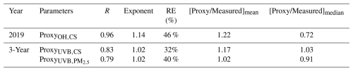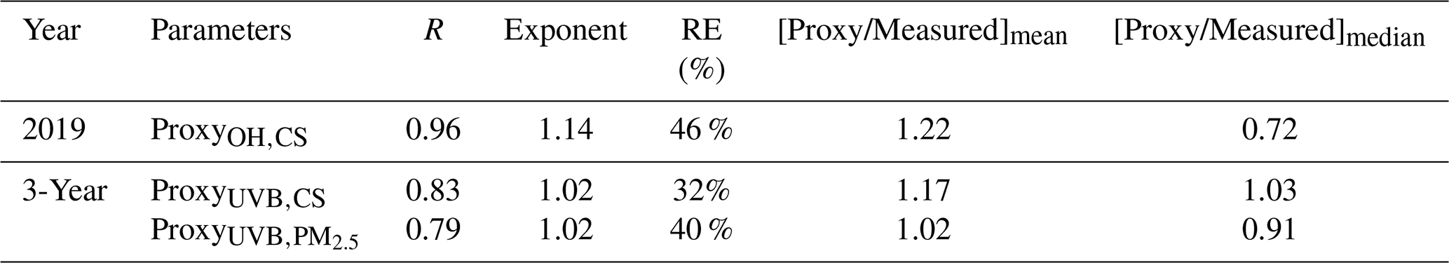The uncertainties of the OH–CS, UVB–CS, and UVB–PM2.5 based proxies, based on Eqs. (16)–(18), are estimated to be 41.7 %, 96.1 %, and 100.4 %, respectively. Details are provided in Sect. S3.