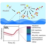 Finally, SO2 can form from the reaction of CH3SOH with O3. CH3SOH is a minor product from the addition reaction of OH with DMS, as the addition reaction primarily forms DMSO (after subsequent reaction with O2).