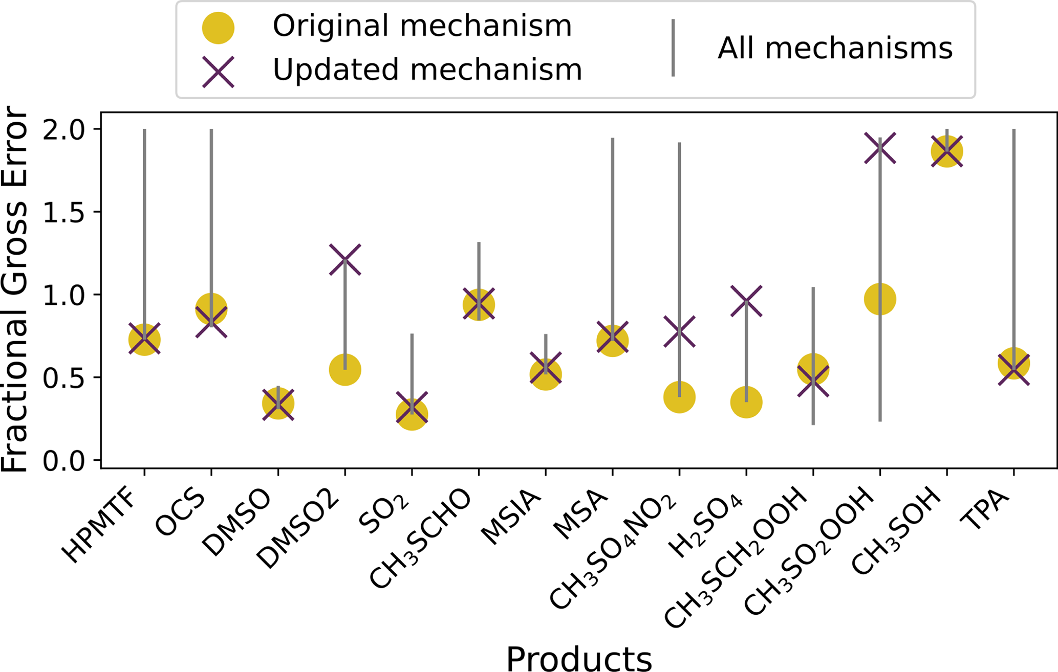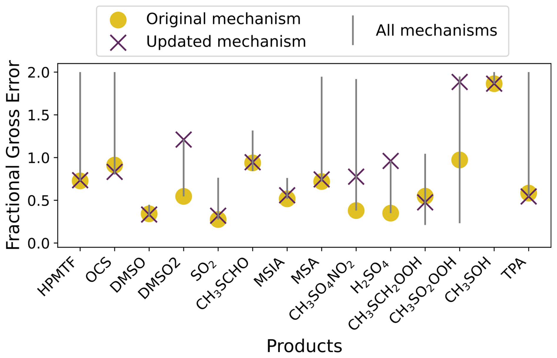 Figure 1The range in the average fractional gross error of four mechanisms (Jernigan, Shen, Ye and MCM, grey line) compared to the error in the updated mechanism (purple cross), and the original mechanism (yellow dot), for each product found in the experiments by Albu et al. (2008), Jernigan et al. (2022), Ye et al. (2022) and Shen et al. (2022).