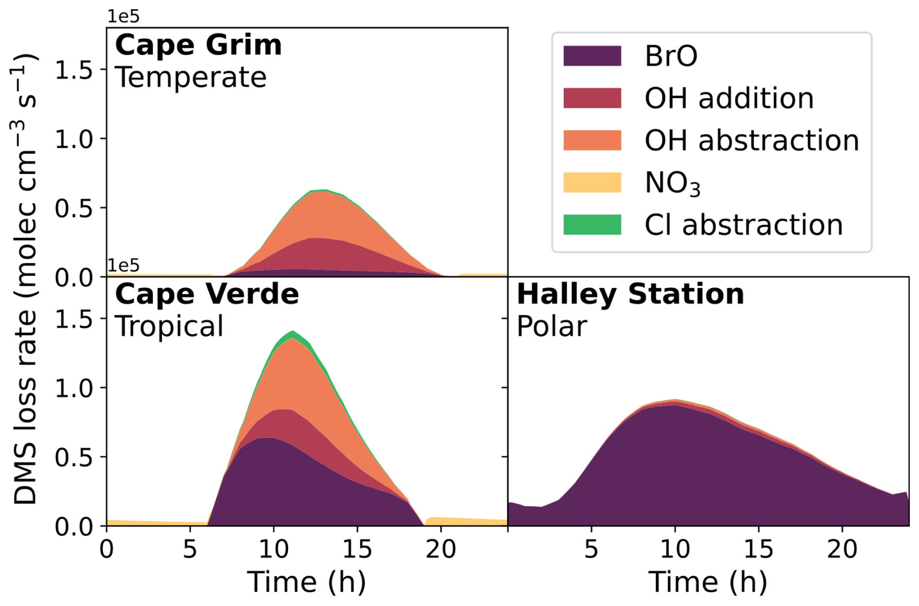 Figure 2The rate of loss of DMS from the major oxidation pathways, BrO, OH, NO3 and Cl, in the three marine regime scenarios on the last day of the eight-day box model run.