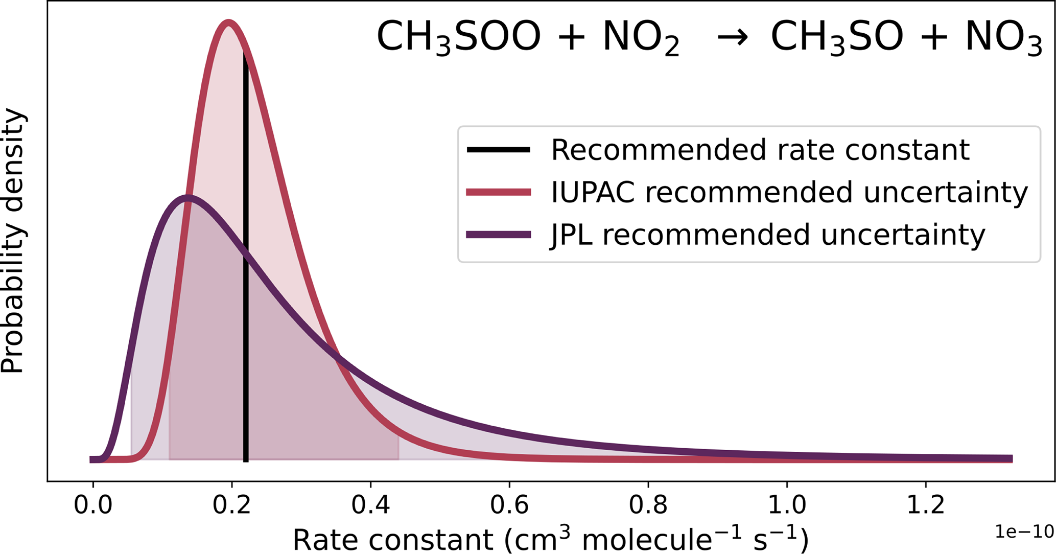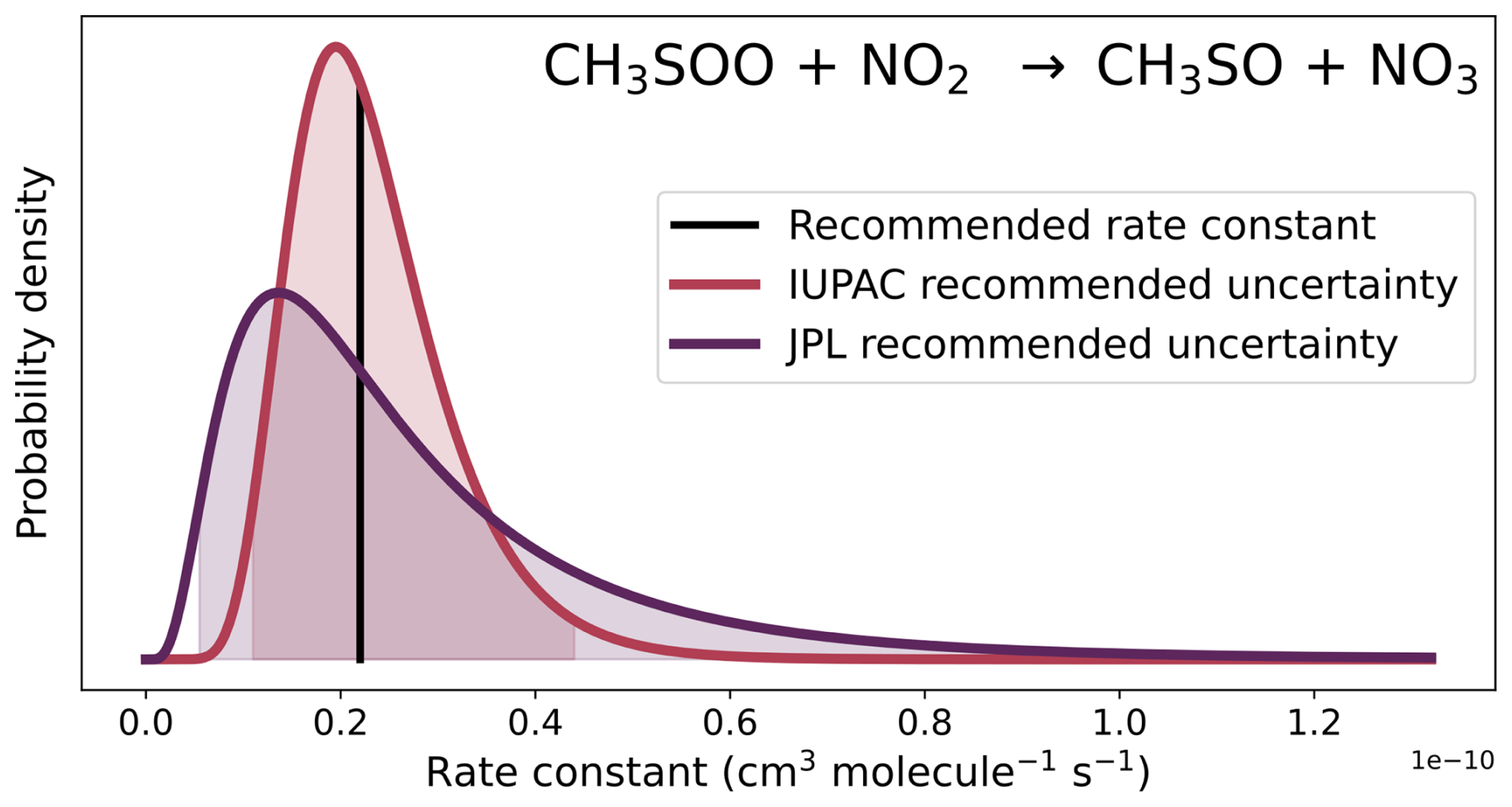 Figure 4The recommended rate constant for the reaction of CH3SOO with NO2 (black line), and the probability distributions for that rate constant at 298 K from the IUPAC (red line), and NASA panel report (JPL, purple line) recommendations. The shaded areas represent the 95 % confidence intervals in the rate constants.
