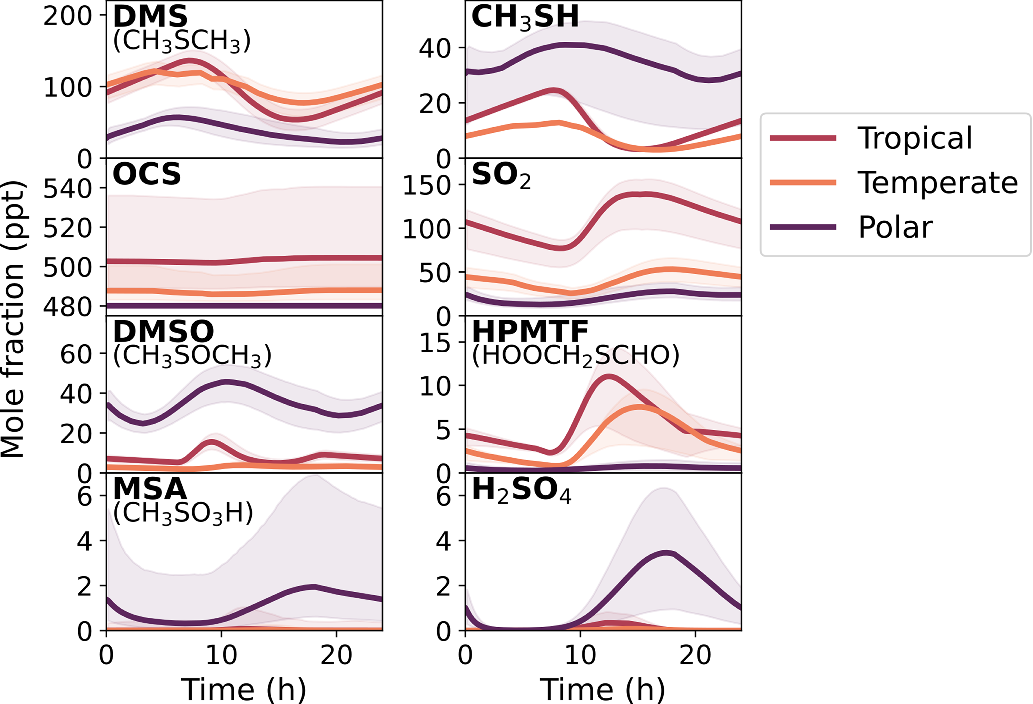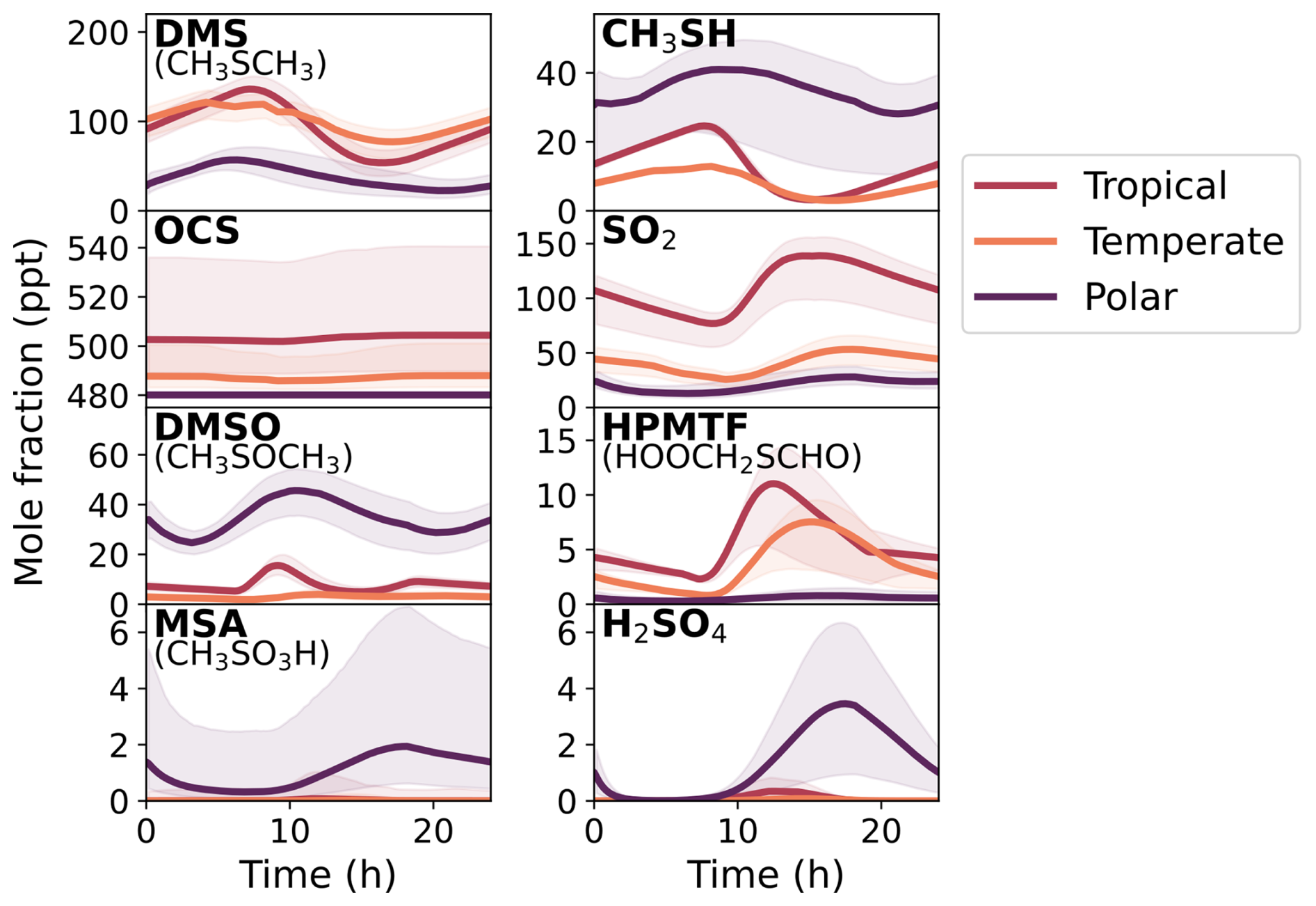 Figure 5 shows that the concentration of MSA had the largest relative uncertainty, with average upper uncertainties of 3000 %, 4000 % and 400 % for the tropical, temperate, and polar box models, respectively. The relative uncertainty was smaller during the daylight hours, when the diurnal concentration of MSA peaked (from around 12:00 p.m. to 05:00 p.m.), but larger at night – hinting at specific processes that dominate the uncertainty. H2SO4 and OCS were also highly uncertain, with average upper uncertainties ranging from 100 %–200 % (except for OCS in the polar regime, which had an upper uncertainty of 340 %). However, including a background mixing ratio of 480 ppt, due to the long lifetime of OCS (Cartwright et al., 2023), decreases the total uncertainty of OCS to within ±7 % for all regimes. Although the average uncertainty in the concentration of CH3SH was within ±12 % in the tropical and temperate regimes, an average upper uncertainty of 25 % and lower uncertainty of 55 % was found for CH3SH in the polar regime. The average uncertainties for HPMTF across the tropical, temperate, and polar regimes were within ±39 %, ±43 % and ±86 %, respectively. DMS and SO2 had average uncertainties within ±30 % in the tropical and temperate regimes, and within ±50 % in the polar regime. Finally, the average uncertainty of dimethyl sulfoxide (CH3SOCH3, DMSO) ranged from ±25 %–49 % across all regimes.