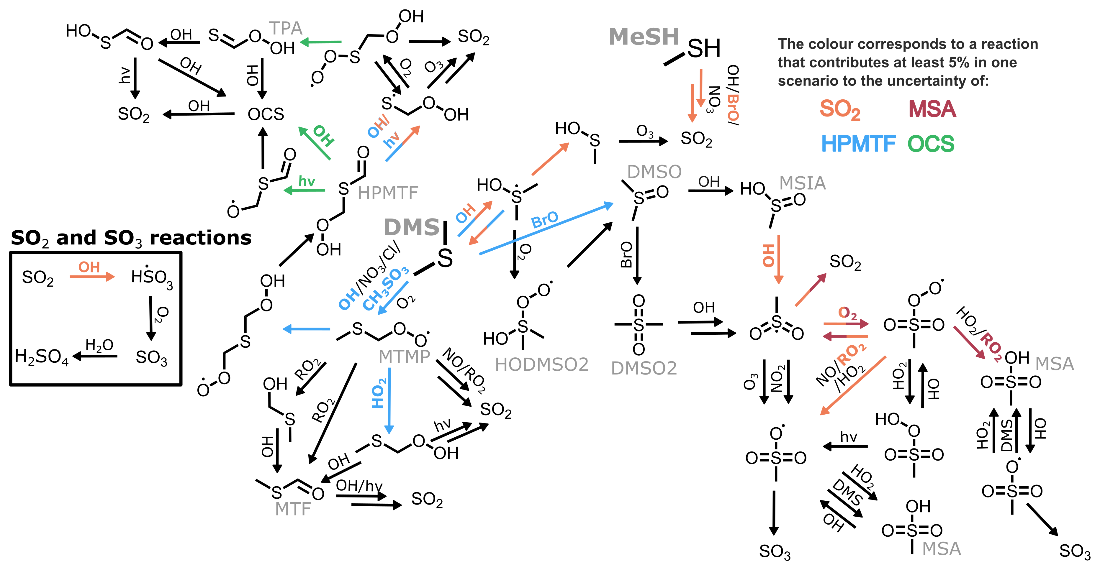 Figure 6A simplified DMS oxidation mechanism highlighting reactions that contribute at least 5 % to the uncertainty of SO2, MSA, HPMTF and OCS, through orange, maroon, blue, and green arrows (respectively).