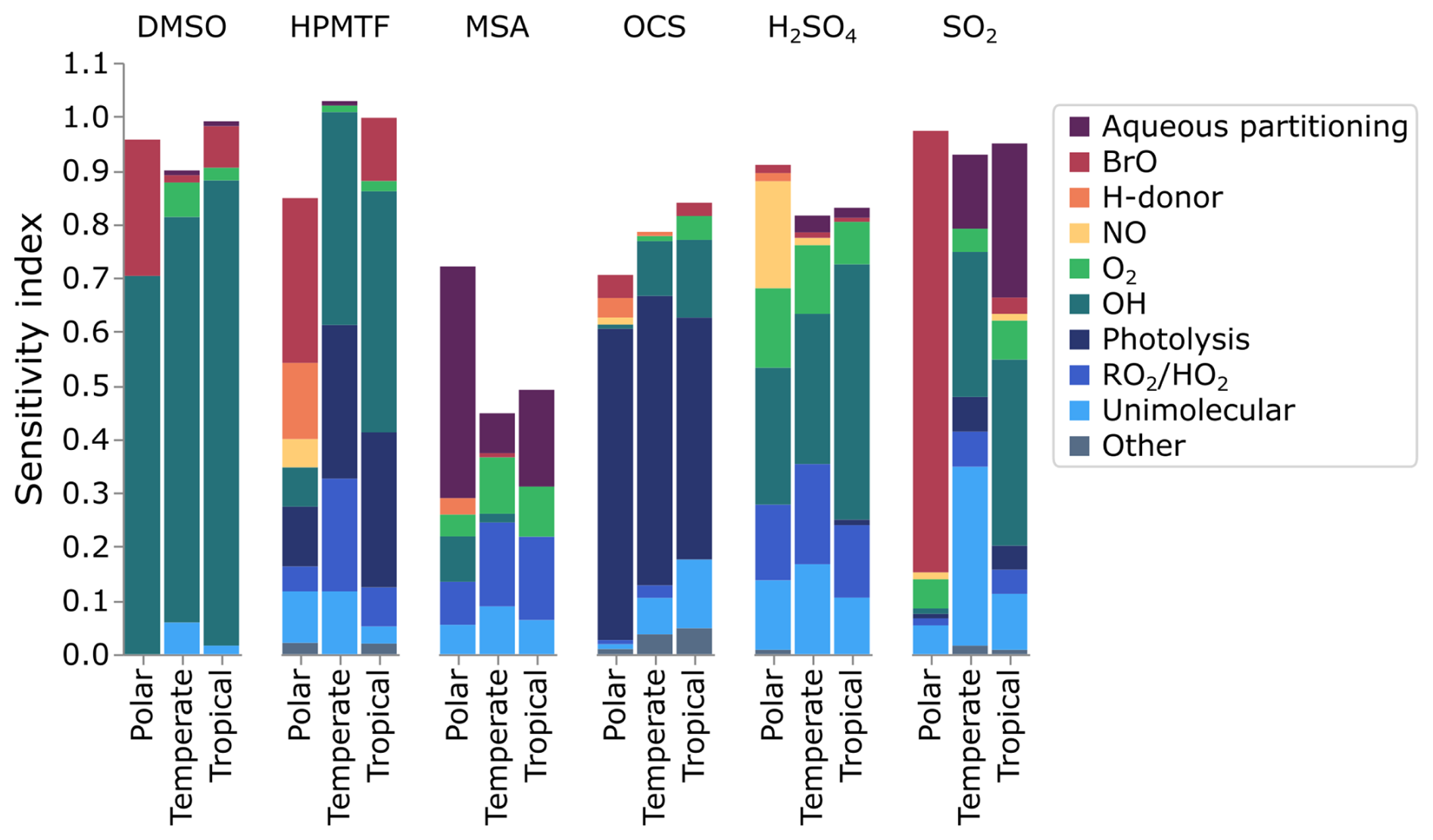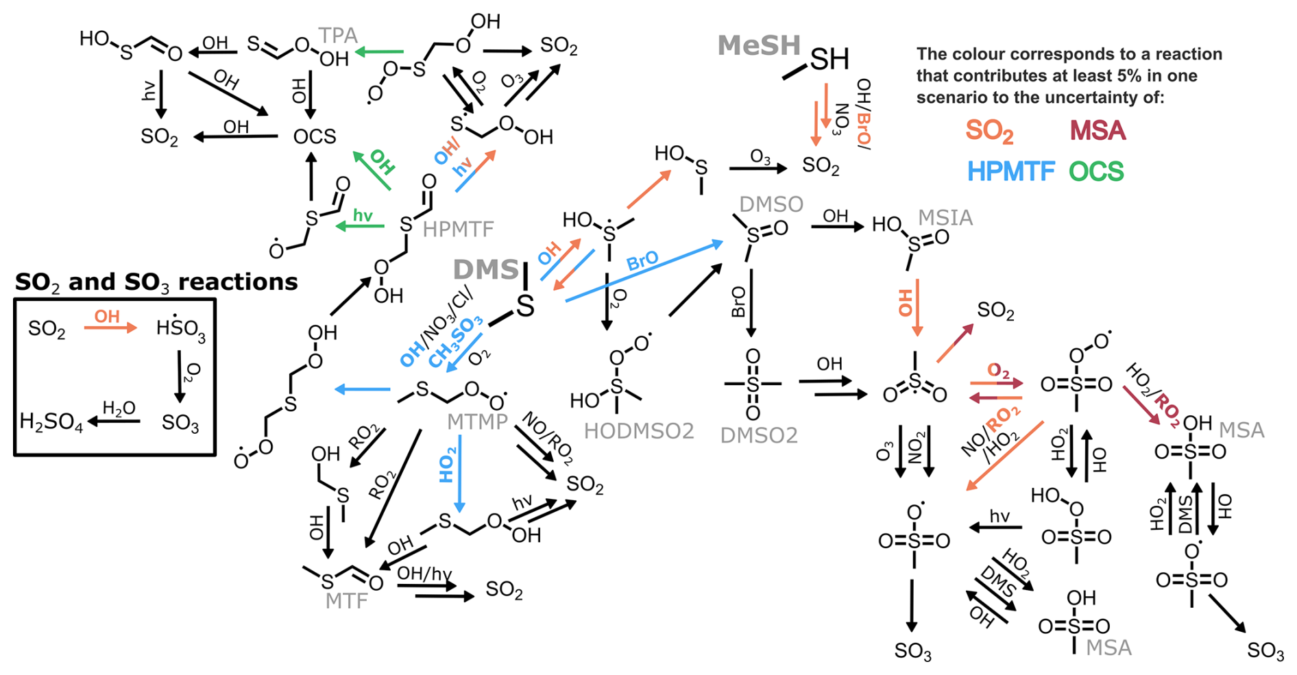OH reactions contribute over 10 % of the uncertainty of DMSO, HPMTF, OCS, H2SO4 and SO2 in the temperate and tropical marine regimes, due to the reactions of OH with SO2, MSIA, DMSO, and HPMTF. The uncertainty in these reactions is generally low, as they have been explored experimentally, with a maximum uncertainty factor of 3.23 (for the reaction of SO2 with OH at 269 K). However, their contribution to the total uncertainty demonstrates their importance.