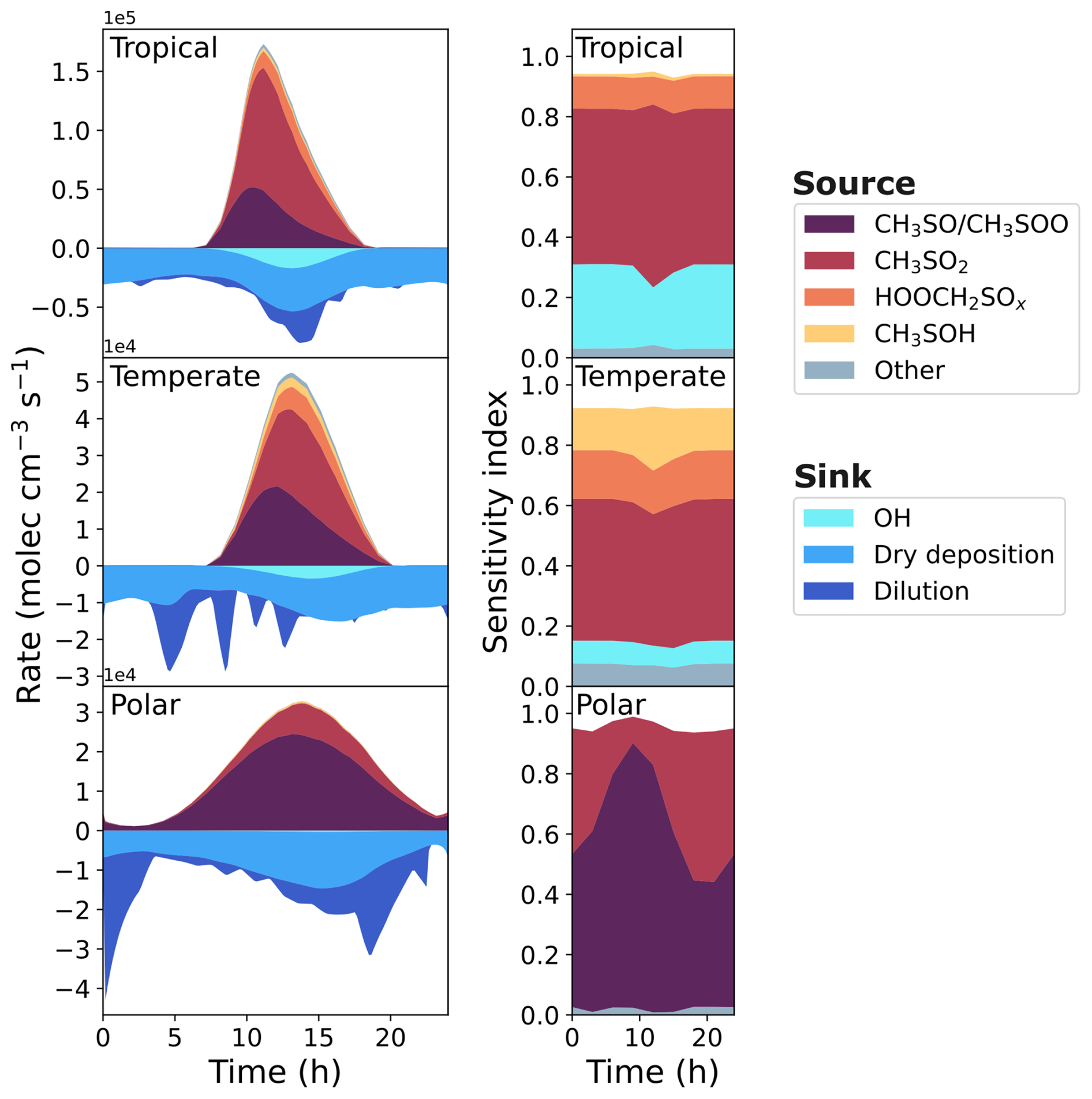 Figure 7The rate of production and loss of SO2 in the base run of the three marine regimes (first column), and the corresponding grouped sensitivity indices for the uncertainty in SO2 concentration (second column).