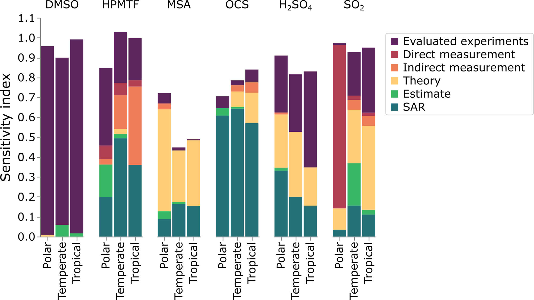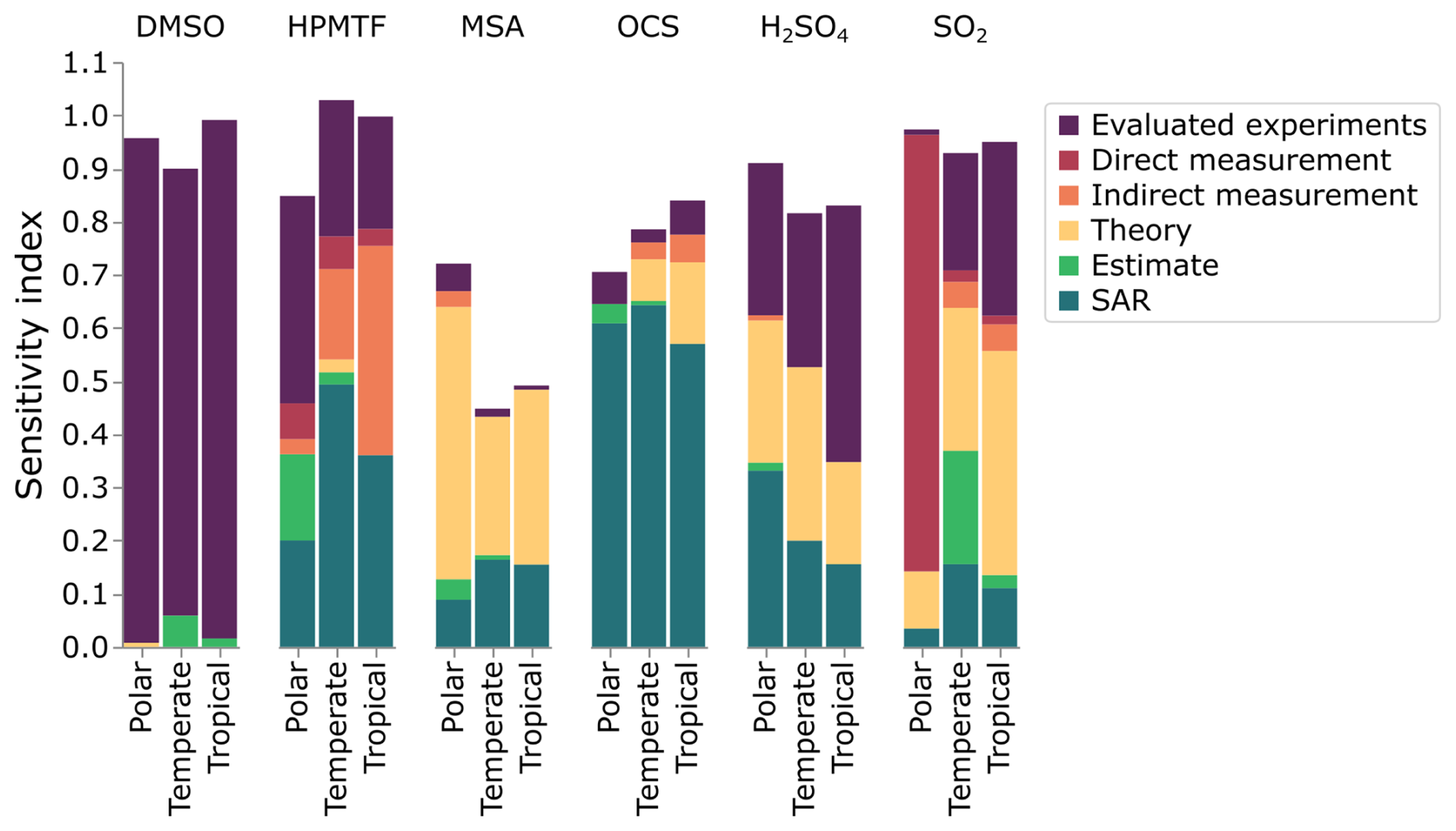 Figure 9 demonstrates that the sources of uncertainty differ between species and marine environments, and can be used to identify how those uncertainties can be reduced. We can use this figure to make some recommendations and general conclusions. We suggest that species whose uncertainties are primarily due to structure-activity relationships or estimates should be focused on by theoreticians, as their work would decrease those uncertainties. When the uncertainty is due to theory, we encourage experimentalists to study those reactions, while rate constants based on a single measurement should also undergo further experimentation to either corroborate or improve the measurement precision (preferably through direct measurements). Finally, large uncertainty factors in the evaluated data could also be reduced through further experiments. As such, Fig. 9 provides a summary of how the uncertainties in the concentrations of DMS oxidation products can be reduced.